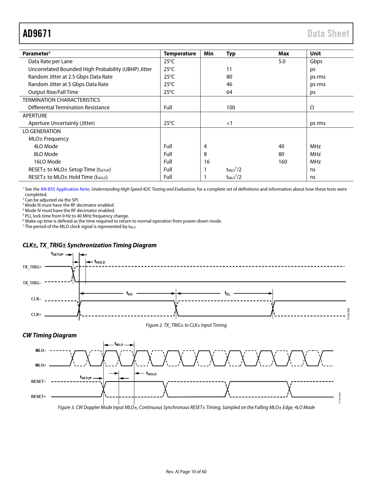 AD9671. Data Sheet. Parameter1 Temperature. Min. Typ. Max. Unit. CLK±, TX_TRIG± Synchronization Timing Diagram. tSETUP. tHOLD. TX_TRIG+