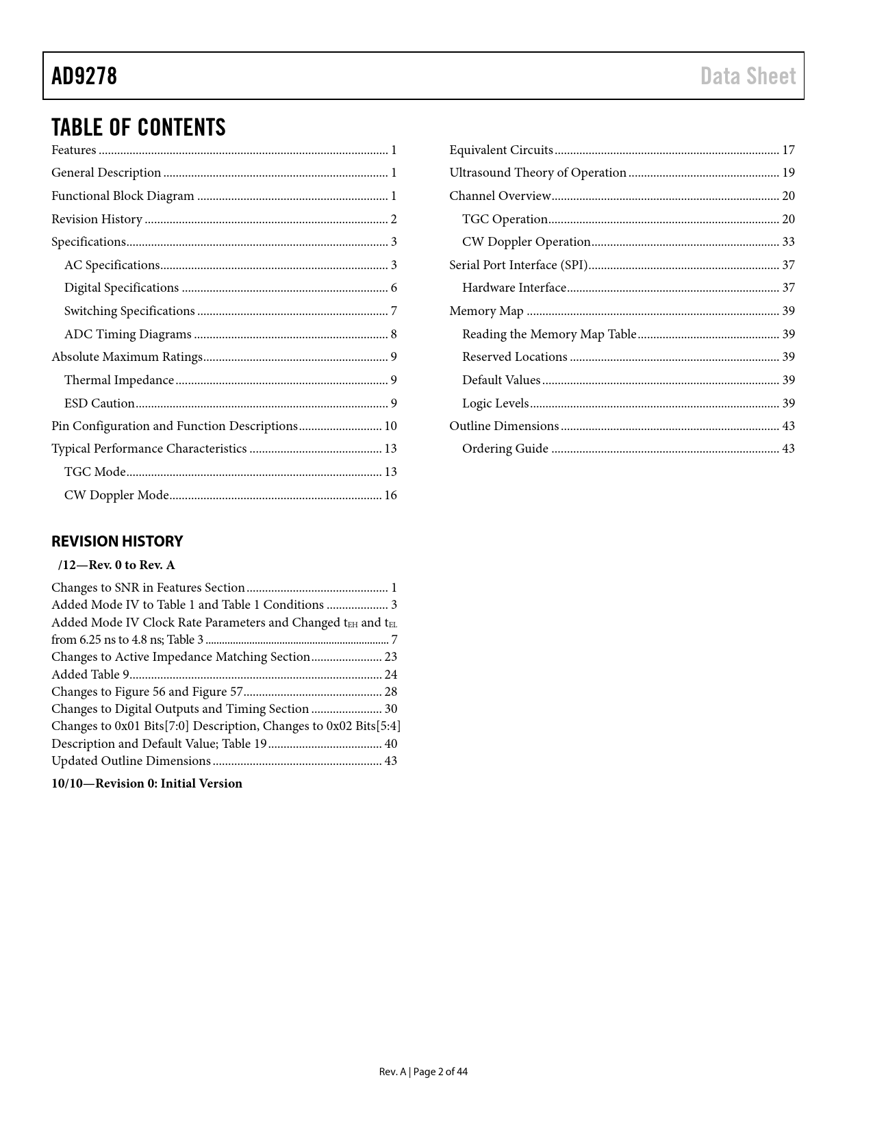 link to page 1 link to page 1 link to page 1 link to page 2 link to page 3 link to page 3 link to page 6 link to page 7 link to page 8 link to page 9 link to page 9 link to page 9 link to page 10 link to page 13 link to page 13 link to page 16 link to page 17 link to page 19 link to page 20 link to page 20 link to page 33 link to page 37 link to page 37 link to page 39 link to page 39 link to page 39 link to page 39 link to page 39 link to page 43 link to page 43 AD9278Data SheetTABLE OF CONTENTS Features .. 1 Equivalent Circuits ... 17 General Description ... 1 Ultrasound Theory of Operation ... 19 Functional Block Diagram .. 1 Channel Overview .. 20 Revision History ... 2 TGC Operation ... 20 Specifications ... 3 CW Doppler Operation ... 33 AC Specifications .. 3 Serial Port Interface (SPI) .. 37 Digital Specifications ... 6 Hardware Interface ... 37 Switching Specifications .. 7 Memory Map .. 39 ADC Timing Diagrams ... 8 Reading the Memory Map Table .. 39 Absolute Maximum Ratings .. 9 Reserved Locations .. 39 Thermal Impedance ... 9 Default Values ... 39 ESD Caution .. 9 Logic Levels ... 39 Pin Configuration and Function Descriptions ... 10 Outline Dimensions ... 43 Typical Performance Characteristics ... 13 Ordering Guide .. 43 TGC Mode ... 13 CW Doppler Mode ... 16 REVISION HISTORY /12—Rev. 0 to Rev. A Changes to SNR in Features Section .. 1 Added Mode IV to Table 1 and Table 1 Conditions .. 3 Added Mode IV Clock Rate Parameters and Changed tEH and tEL from 6.25 ns to 4.8 ns; Table 3 .. ... ... ... .. .. .. .. ... ... ... ... ... 7 Changes to Active Impedance Matching Section ... 23 Added Table 9 .. 24 Changes to Figure 56 and Figure 57 ... 28 Changes to Digital Outputs and Timing Section ... 30 Changes to 0x01 Bits[7:0] Description, Changes to 0x02 Bits[5:4] Description and Default Value; Table 19 ... 40 Updated Outline Dimensions ... 43 10/10—Revision 0: Initial Version Rev. A | Page 2 of 44 Document Outline Features General Description Functional Block Diagram Revision History Specifications AC Specifications Digital Specifications Switching Specifications ADC Timing Diagrams Absolute Maximum Ratings Thermal Impedance ESD Caution Pin Configuration and Function Descriptions Typical Performance Characteristics TGC Mode CW Doppler Mode Equivalent Circuits Ultrasound Theory of Operation Channel Overview TGC Operation Low Noise Amplifier (LNA) Active Impedance Matching LNA Noise Input Overdrive Variable Gain Amplifier (VGA) Gain Control VGA Noise Antialiasing Filter (AAF) ADC Clock Input Considerations Clock Duty Cycle Considerations Clock Jitter Considerations Power Dissipation and Power-Down Mode Power and Ground Recommendations Digital Outputs and Timing SDIO Pin SCLK Pin CSB Pin RBIAS Pin Voltage Reference CW Doppler Operation Quadrature Generation I/Q Demodulator and Phase Shifter Dynamic Range and Noise Phase Compensation and Analog Beamforming CW Application Information Serial Port Interface (SPI) Hardware Interface Memory Map Reading the Memory Map Table Reserved Locations Default Values Logic Levels Outline Dimensions Ordering Guide