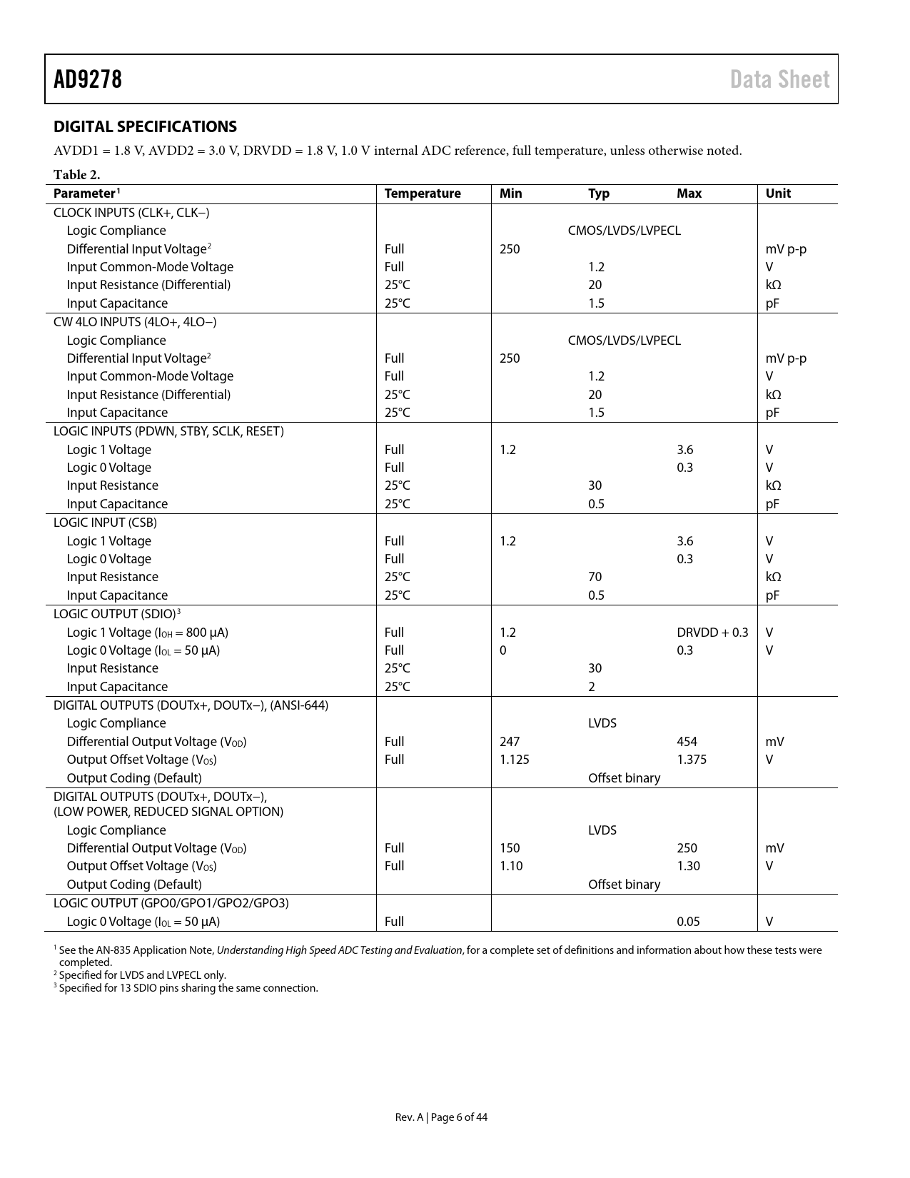 link to page 6 link to page 6 link to page 6 link to page 6 AD9278Data SheetDIGITAL SPECIFICATIONS AVDD1 = 1.8 V, AVDD2 = 3.0 V, DRVDD = 1.8 V, 1.0 V internal ADC reference, full temperature, unless otherwise noted. Table 2. Parameter1TemperatureMinTypMaxUnit CLOCK INPUTS (CLK+, CLK−) Logic Compliance CMOS/LVDS/LVPECL Differential Input Voltage2 Full 250 mV p-p Input Common-Mode Voltage Full 1.2 V Input Resistance (Differential) 25°C 20 kΩ Input Capacitance 25°C 1.5 pF CW 4LO INPUTS (4LO+, 4LO−) Logic Compliance CMOS/LVDS/LVPECL Differential Input Voltage2 Full 250 mV p-p Input Common-Mode Voltage Full 1.2 V Input Resistance (Differential) 25°C 20 kΩ Input Capacitance 25°C 1.5 pF LOGIC INPUTS (PDWN, STBY, SCLK, RESET) Logic 1 Voltage Full 1.2 3.6 V Logic 0 Voltage Full 0.3 V Input Resistance 25°C 30 kΩ Input Capacitance 25°C 0.5 pF LOGIC INPUT (CSB) Logic 1 Voltage Full 1.2 3.6 V Logic 0 Voltage Full 0.3 V Input Resistance 25°C 70 kΩ Input Capacitance 25°C 0.5 pF LOGIC OUTPUT (SDIO)3 Logic 1 Voltage (IOH = 800 μA) Full 1.2 DRVDD + 0.3 V Logic 0 Voltage (IOL = 50 μA) Full 0 0.3 V Input Resistance 25°C 30 Input Capacitance 25°C 2 DIGITAL OUTPUTS (DOUTx+, DOUTx−), (ANSI-644) Logic Compliance LVDS Differential Output Voltage (VOD) Full 247 454 mV Output Offset Voltage (VOS) Full 1.125 1.375 V Output Coding (Default) Offset binary DIGITAL OUTPUTS (DOUTx+, DOUTx−), (LOW POWER, REDUCED SIGNAL OPTION) Logic Compliance LVDS Differential Output Voltage (VOD) Full 150 250 mV Output Offset Voltage (VOS) Full 1.10 1.30 V Output Coding (Default) Offset binary LOGIC OUTPUT (GPO0/GPO1/GPO2/GPO3) Logic 0 Voltage (IOL = 50 μA) Full 0.05 V 1 See the AN-835 Application Note, Understanding High Speed ADC Testing and Evaluation, for a complete set of definitions and information about how these tests were completed. 2 Specified for LVDS and LVPECL only. 3 Specified for 13 SDIO pins sharing the same connection. Rev. A | Page 6 of 44 Document Outline Features General Description Functional Block Diagram Revision History Specifications AC Specifications Digital Specifications Switching Specifications ADC Timing Diagrams Absolute Maximum Ratings Thermal Impedance ESD Caution Pin Configuration and Function Descriptions Typical Performance Characteristics TGC Mode CW Doppler Mode Equivalent Circuits Ultrasound Theory of Operation Channel Overview TGC Operation Low Noise Amplifier (LNA) Active Impedance Matching LNA Noise Input Overdrive Variable Gain Amplifier (VGA) Gain Control VGA Noise Antialiasing Filter (AAF) ADC Clock Input Considerations Clock Duty Cycle Considerations Clock Jitter Considerations Power Dissipation and Power-Down Mode Power and Ground Recommendations Digital Outputs and Timing SDIO Pin SCLK Pin CSB Pin RBIAS Pin Voltage Reference CW Doppler Operation Quadrature Generation I/Q Demodulator and Phase Shifter Dynamic Range and Noise Phase Compensation and Analog Beamforming CW Application Information Serial Port Interface (SPI) Hardware Interface Memory Map Reading the Memory Map Table Reserved Locations Default Values Logic Levels Outline Dimensions Ordering Guide