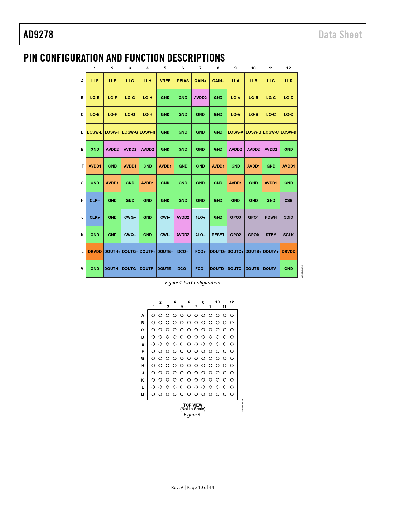AD9278 Data Sheet PIN CONFIGURATION AND FUNCTION DESCRIPTIONS 1 2 3 4 5 6 7 8 9 10 11 12 A LI-E LI-F LI-G LI-H VREF RBIAS GAIN+ GAIN– LI-A LI-B LI-C LI-D B LG-E LG-F LG-G LG-H GND GND AVDD2 GND LG-A LG-B LG-C LG-D C LO-E LO-F LO-G LO-H GND GND GND GND LO-A LO-B LO-C LO-D D LOSW-E LOSW-F LOSW-G LOSW-H GND GND GND GND LOSW-A LOSW-B LOSW-C LOSW-D E GND AVDD2 AVDD2 AVDD2 GND GND GND GND AVDD2 AVDD2 AVDD2 GND F AVDD1 GND AVDD1 GND AVDD1 GND GND AVDD1 GND AVDD1 GND AVDD1 G GND AVDD1 GND AVDD1 GND GND GND GND AVDD1 GND AVDD1 GND H CLK– GND GND GND GND GND GND GND GND GND GND CSB J CLK+ GND CWQ+ GND CWI+ AVDD2 4LO+ GND GPO3 GPO1 PDWN SDIO K GND GND CWQ– GND CWI– AVDD2 4LO– RESET GPO2 GPO0 STBY SCLK L DRVDD DOUTH+ DOUTG+ DOUTF+ DOUTE+ DCO+ FCO+ DOUTD+ DOUTC+ DOUTB+ DOUTA+ DRVDD