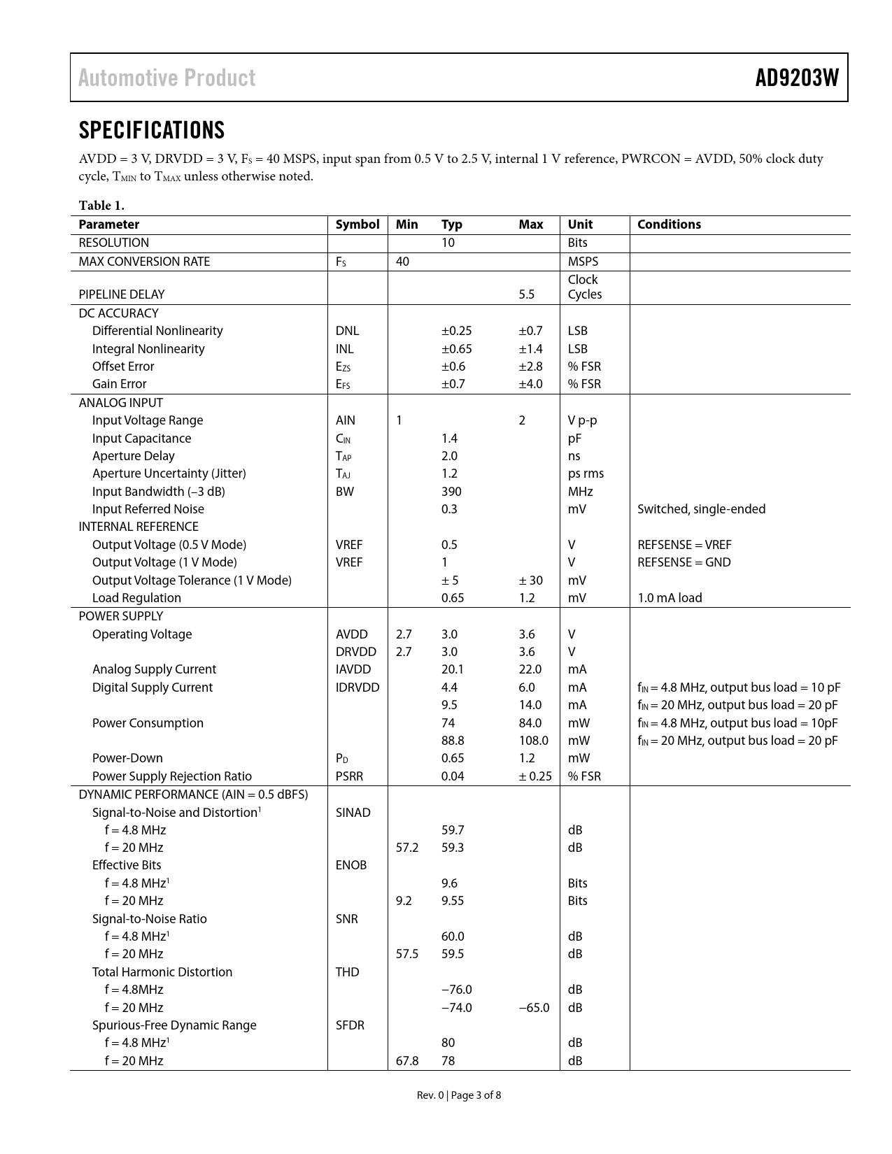 Automotive Product AD9203W SPECIFICATIONS Table 1 Parameter Symbol Min Typ Max Unit Conditions