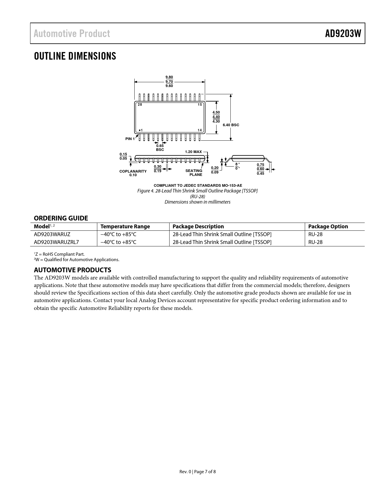 AD9203WARUZ −40°C to +85°C 28-Lead Thin Shrink Small Outline [TSSOP] RU-28 AD9203WARUZRL7 −40°C to +85°C 28-Lead Thin Shrink Small Outline [TSSOP] RU-28 1Z = RoHS Compliant Part. 2W = Qualified for Automotive Applications.