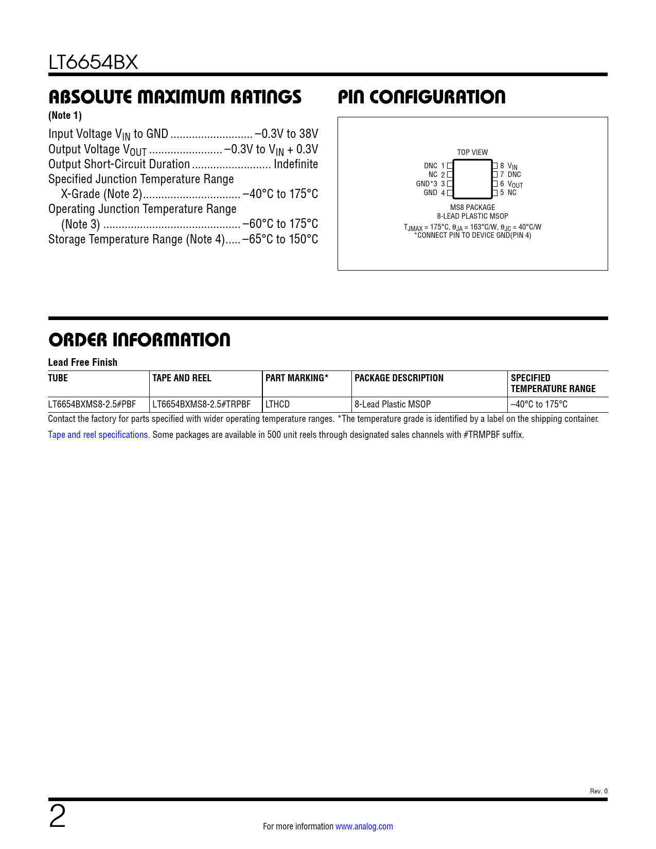 LT6654BXMS8-2.5#PBF LT6654BXMS8-2.5#TRPBF LTHCD 8-Lead Plastic MSOP –40°C to 175°C Contact the factory for parts specified with wider operating temperature ranges. *The temperature grade is identified by a label on the shipping container. Tape and reel specifications. Some packages are available in 500 unit reels through designated sales channels with #TRMPBF suffix. Rev. 0 2 For more information www.analog.com Document Outline Features Applications Typical Application Description Absolute Maximum Ratings Order Information Pin Configuration Electrical Characteristics Typical Performance Characteristics Pin Functions Block Diagram Applications Information Package Description Typical Application Related Parts