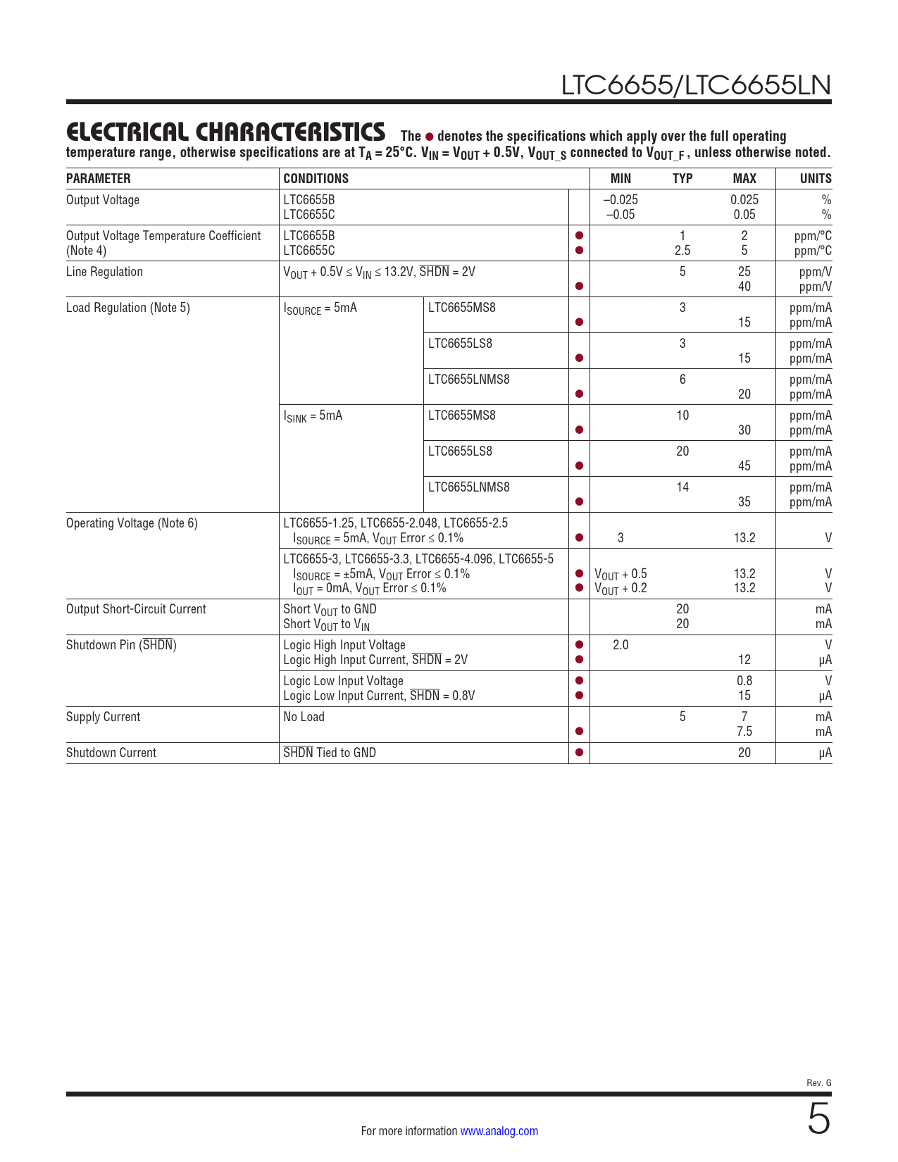 Output Voltage LTC6655B –0.025 0.025 % LTC6655C –0.05 0.05 % Output Voltage Temperature Coefficient LTC6655B l 1 2 ppm/°C (Note 4) LTC6655C l 2.5 5 ppm/°C Line Regulation VOUT + 0.5V ≤ VIN ≤ 13.2V, SHDN = 2V 5 25 ppm/V l 40 ppm/V Load Regulation (Note 5) ISOURCE = 5mA LTC6655MS8 3 ppm/mA l 15 ppm/mA LTC6655LS8 3 ppm/mA l 15 ppm/mA LTC6655LNMS8 6 ppm/mA l 20 ppm/mA ISINK = 5mA LTC6655MS8 10 ppm/mA l 30 ppm/mA LTC6655LS8 20 ppm/mA l 45 ppm/mA LTC6655LNMS8 14 ppm/mA l 35 ppm/mA Operating Voltage (Note 6) LTC6655-1.25, LTC6655-2.048, LTC6655-2.5 ISOURCE = 5mA, VOUT Error ≤ 0.1% l 3 13.2 V LTC6655-3, LTC6655-3.3, LTC6655-4.096, LTC6655-5 ISOURCE = ±5mA, VOUT Error ≤ 0.1% l VOUT + 0.5 13.2 V IOUT = 0mA, VOUT Error ≤ 0.1% l VOUT + 0.2 13.2 V Output Short-Circuit Current Short VOUT to GND 20 mA Short VOUT to VIN 20 mA Shutdown Pin (SHDN) Logic High Input Voltage l 2.0 V Logic High Input Current, SHDN = 2V l 12 µA Logic Low Input Voltage l 0.8 V Logic Low Input Current, SHDN = 0.8V l 15 µA Supply Current No Load 5 7 mA l 7.5 mA Shutdown Current SHDN Tied to GND l 20 µA Rev. G For more information www.analog.com 5 Document Outline Features Applications Description Typical Application Absolute Maximum Ratings Pin Configuration Order Information Available Options Electrical Characteristics Typical Performance Characteristics Pin Functions Block Diagram Applications Information Typical Applications Package Description Revision History Typical Application Related Parts