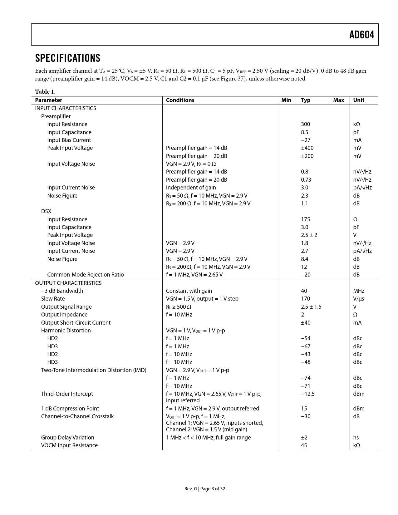 AD604. SPECIFICATIONS. Table 1. Parameter. Conditions. Min. Typ. Max. Unit