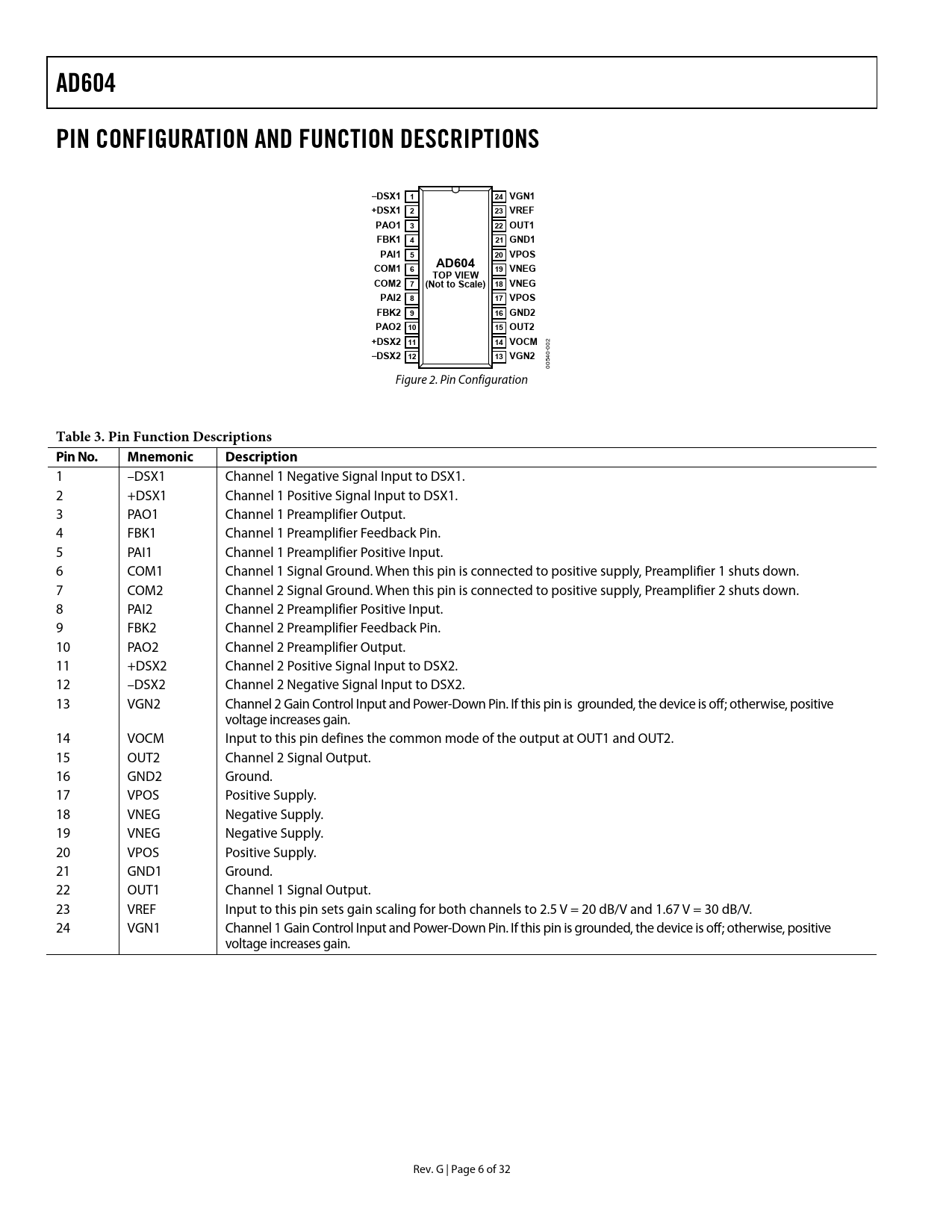 AD604. PIN CONFIGURATION AND FUNCTION DESCRIPTIONS. –DSX1 1. 24 VGN1. +DSX1 2. 23 VREF. PAO1 3. 22 OUT1. FBK1 4. 21 GND1. PAI1 5. 20 VPOS