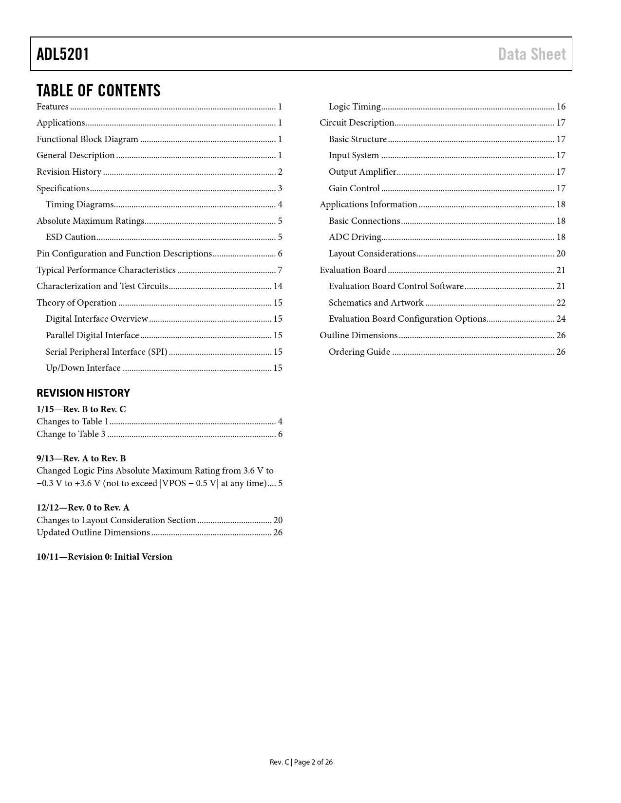 Seiten / Seite26 / 2 — ADL5201. Data Sheet. TABLE OF CONTENTS. REVISION HISTORY. 1/15—Rev. B to …