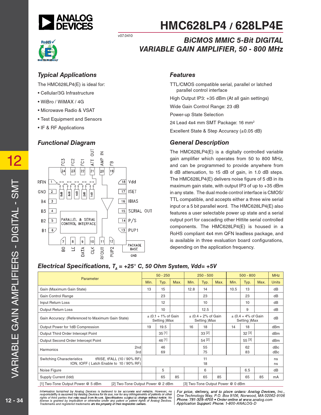 HMC628LP4 / 628LP4E. BiCMOS MMIC 5-Bit DIGITAL. VARIABLE GAIN AMPLIFIER, 50 - 800 MHz. Typical Applications. Features