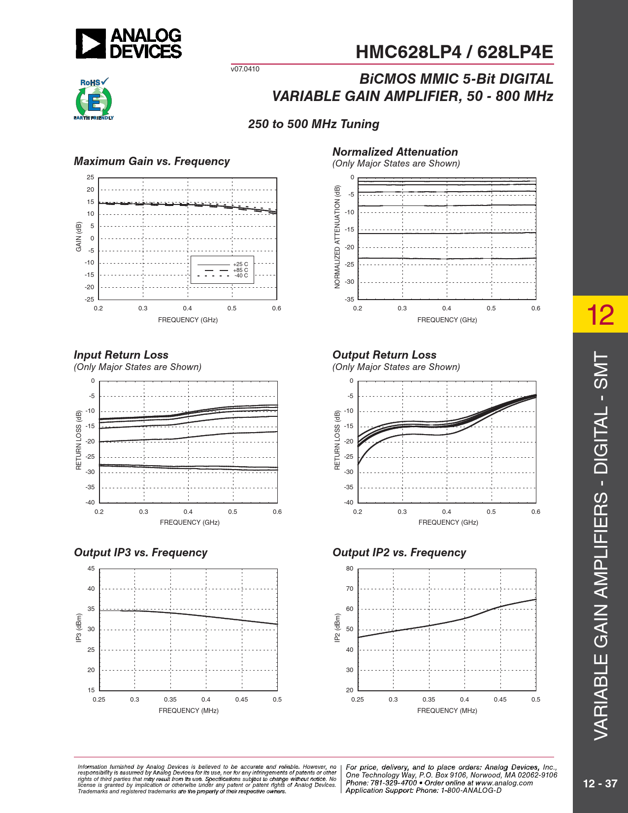 HMC628LP4 / 628LP4E. BiCMOS MMIC 5-Bit DIGITAL. VARIABLE GAIN AMPLIFIER, 50 - 800 MHz. 250 to 500 MHz Tuning
