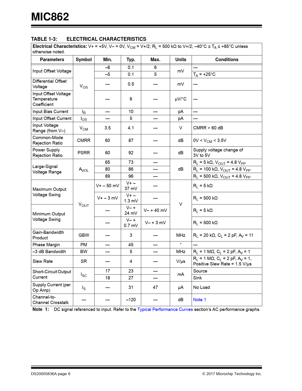 link to page 6 link to page 8 MIC862TABLE 1-3:ELECTRICAL CHARACTERISTICSElectrical Characteristics: V+ = +5V, V– = 0V, VCM = V+/2; RL = 500 kΩ to V+/2; –40°C ≤ TA ≤ +85°C unless otherwise noted. ParametersSymbolMin.Typ.Max.UnitsConditions –6 0.1 6 — Input Offset Voltage mV –5 0.1 5 TA = +25°C Differential Offset — 0.5 — mV — Voltage VOS Input Offset Voltage Temperature — 6 — µV/°C — Coefficient Input Bias Current IB — 10 — pA — Input Offset Current IOS — 5 — pA — Input Voltage V Range (from V–) CM 3.5 4.1 — V CMRR > 60 dB Common-Mode CMRR 60 87 — dB 0V < V Rejection Ratio CM < 3.5V Power Supply Supply voltage change of PSRR 60 92 — dB Rejection Ratio 3V to 5V 65 73 — RL = 5 kΩ, VOUT = 4.8 VPP Large-Signal A 80 86 — dB R Voltage Range VOL L = 100 kΩ, VOUT = 4.8 VPP 89 96 — RL = 500 kΩ, VOUT = 4.8 VPP V+ – V+ – 50 mV — R Maximum Output 37 mV L = 5 kΩ Voltage Swing V+ – V+ – 3 mV — R 1.3 mV L = 500 kΩ VOUT V V– + — V– + 40 mV R Minimum Output 24 mV L = 5 kΩ Voltage Swing V– + — V– + 3 mV R 0.7 mV L = 500 kΩ Gain-Bandwidth GBW — 3 — MHz R Product L = 20 kΩ, CL = 2 pF, AV = 11 Phase Margin PM — 45 — ° — –3 dB Bandwidth BW — 5 — MHz RL = 1 MΩ, CL = 2 pF, AV = 1 R Slew Rate SR — 4 — V/µs L = 1 MΩ, CL = 2 pF, AV = 1, Positive Slew Rate = 1.5 V/µs Short-Circuit Output 17 23 — Source I mA Current SC 18 27 — Sink Supply Current (per I Op Amp) S — 31 47 µA No Load Channel-to- — — –120 — dB Note 1 Channel Crosstalk Note 1: DC signal referenced to input. Refer to the Typical Performance Curves section’s AC performance graphs. DS20005836A-page 6 2017 Microchip Technology Inc. Document Outline 1.0 Electrical Characteristics 2.0 Typical Performance Curves 3.0 Pin Descriptions 4.0 Application Information 4.1 Power Supply Bypassing 4.2 Supply and Loading Resistive Considerations 4.3 Capacitive Load 5.0 Packaging Information 5.1 Package Marking Information Appendix A: Revision History Product Identification System Worldwide Sales and Service