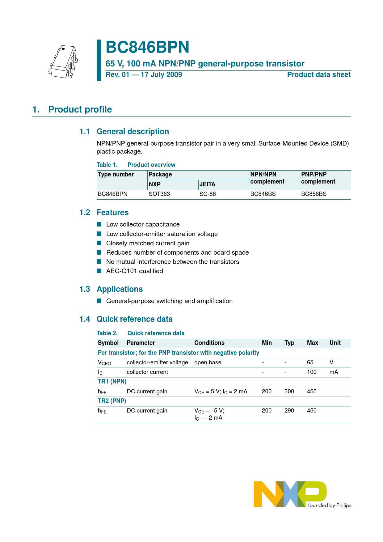BC846BPN 65 V, 100 mA NPN/PNP general-purpose transistor. Rev. 01 — 17 July 2009. Product data sheet. Product profile