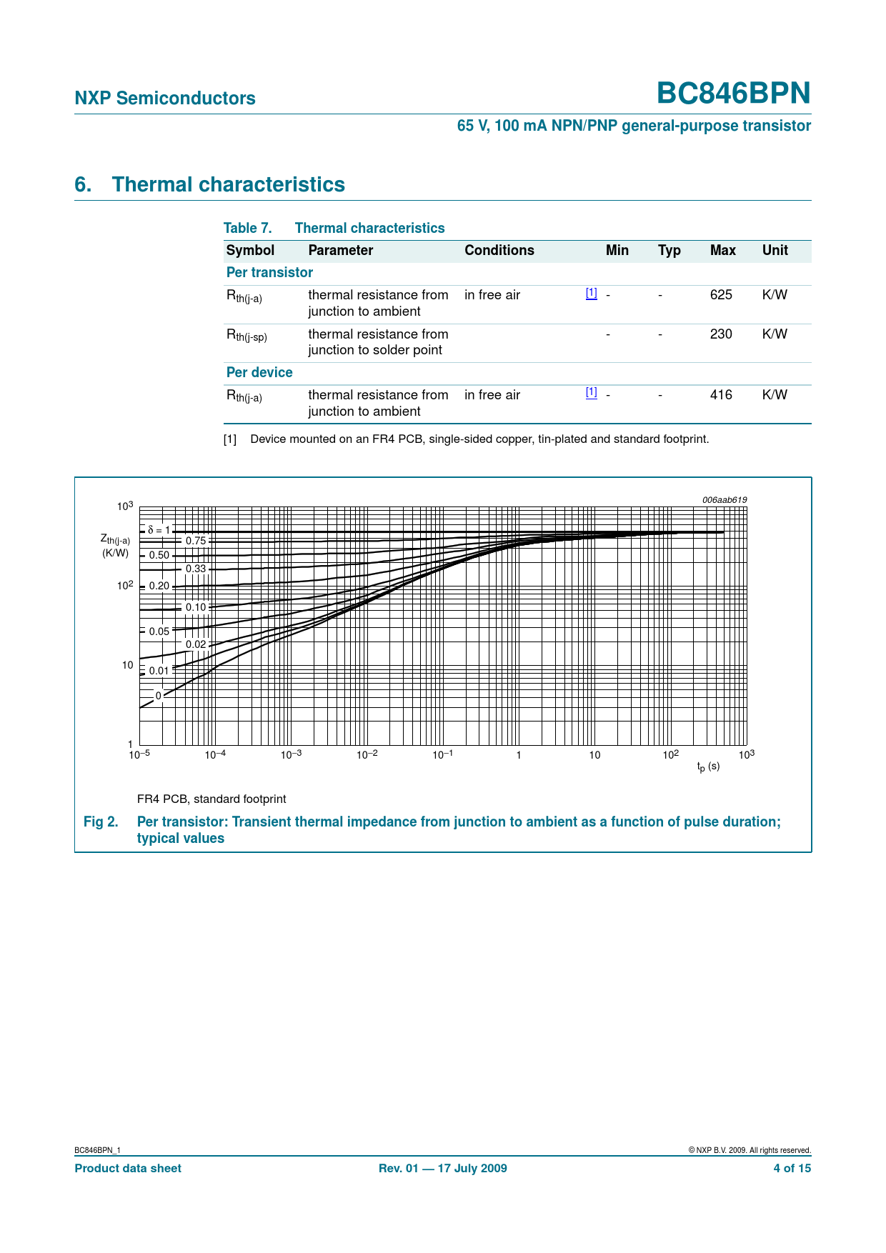 NXP Semiconductors. BC846BPN. 65 V, 100 mA NPN/PNP general-purpose transistor. Thermal characteristics. Table 7. Symbol. Parameter