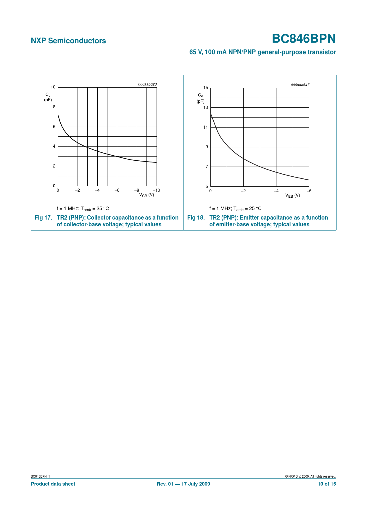 006aab623 006aaa547 10 15 Cc Ce (pF) (pF) 8 13 6 11 4 9 2 7 0 5 0 −2 −4 −6 −8 −10 0 −2 −4 −6 VCB (V) VEB (V) f = 1 MHz; Tamb = 25 °C f = 1 MHz; Tamb = 25 °C
