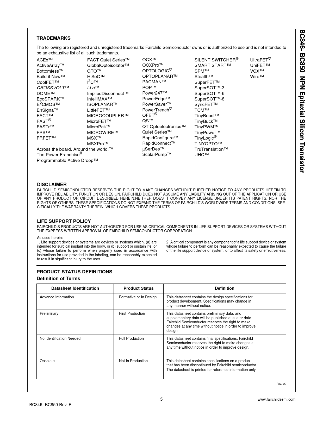 BC8. TRADEMARKS. 46- BC850. NPN. Epit. axial Silicon T. ransistor. DISCLAIMER. LIFE SUPPORT POLICY. PRODUCT STATUS DEFINITIONS