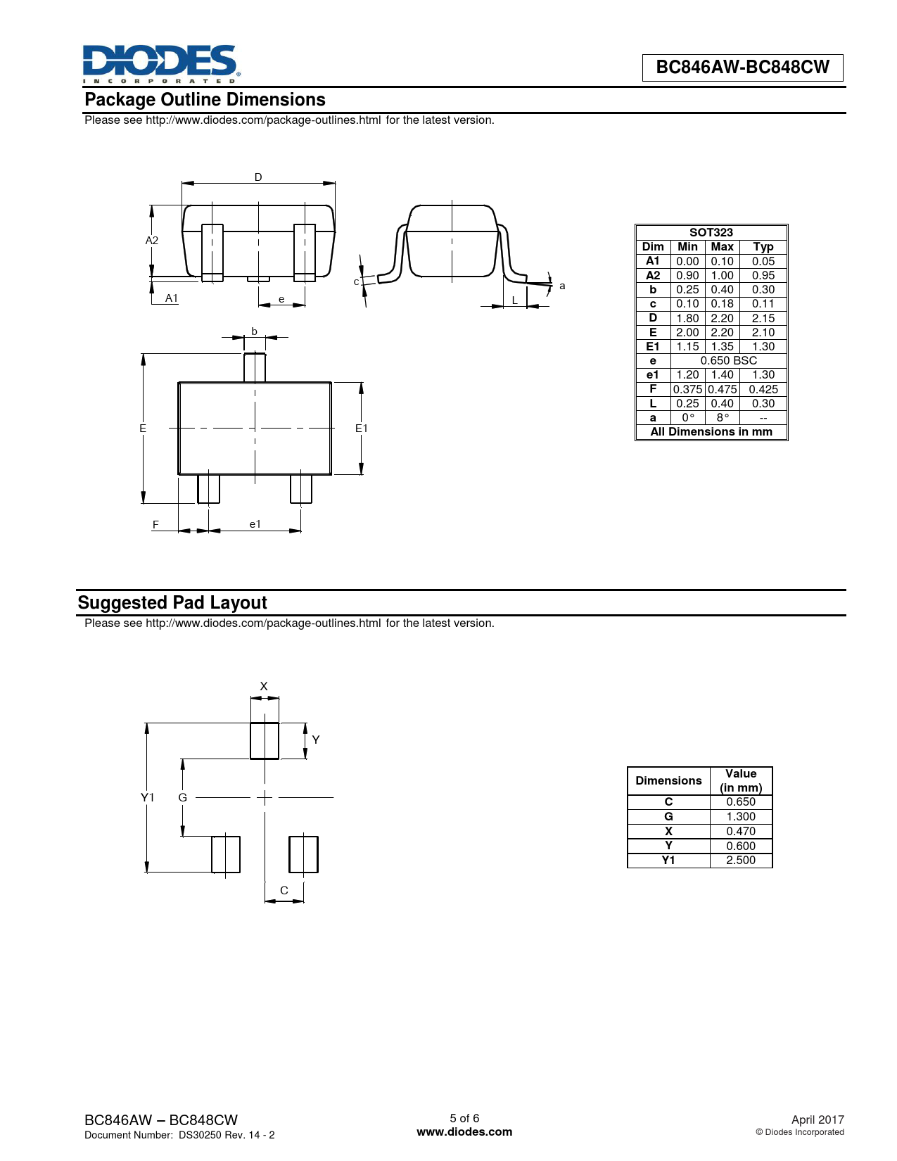 BC846AW-BC848CW. Package Outline Dimensions. SOT323. Dim Min Max. Typ. All Dimensions in mm. Suggested Pad Layout. Value. Dimensions