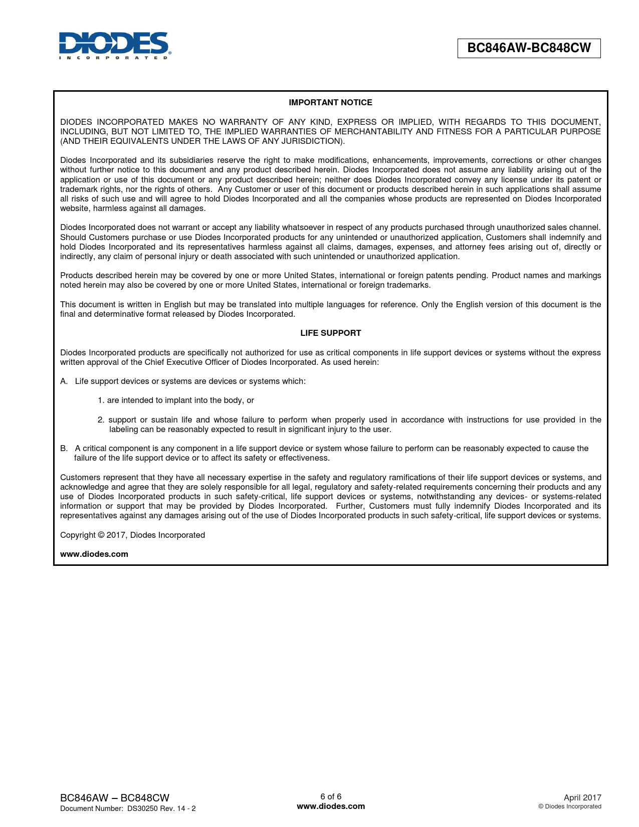 | Seiten / Seite | 6 / 6 — BC846AW-BC848CW. IMPORTANT NOTICE. LIFE SUPPORT. www.diodes.com |