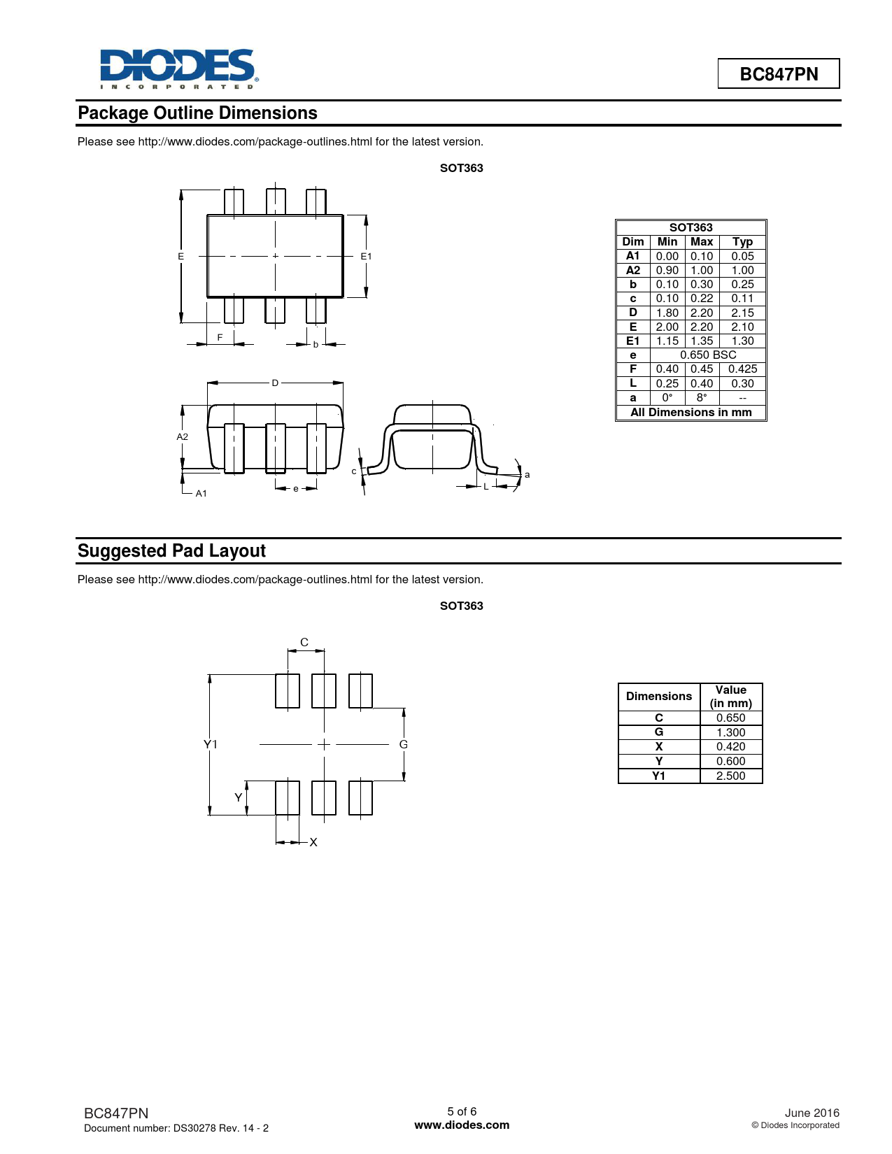 BC847PN. Package Outline Dimensions. SOT363. Dim Min Max. Typ. All Dimensions in mm. Suggested Pad Layout. Value. Dimensions. (in mm)
