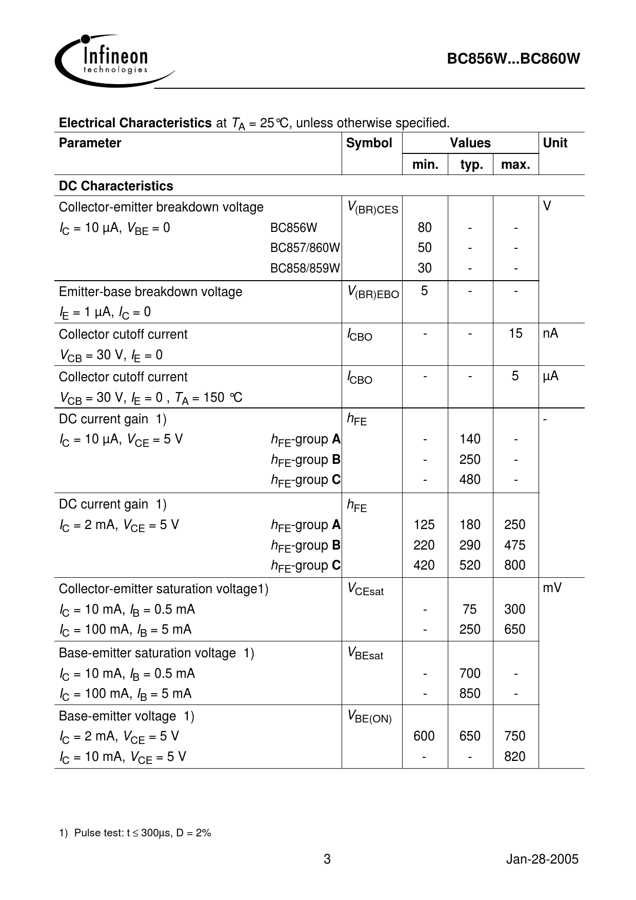 BC856W...BC860W. Electrical Characteristics. Parameter. Symbol. Values. Unit. min. typ. max. DC Characteristics