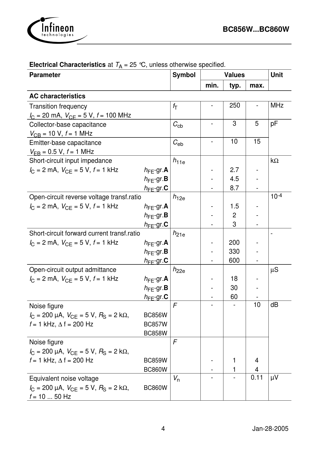 BC856W...BC860W. Electrical Characteristics. Parameter. Symbol. Values. Unit. min. typ. max. AC characteristics
