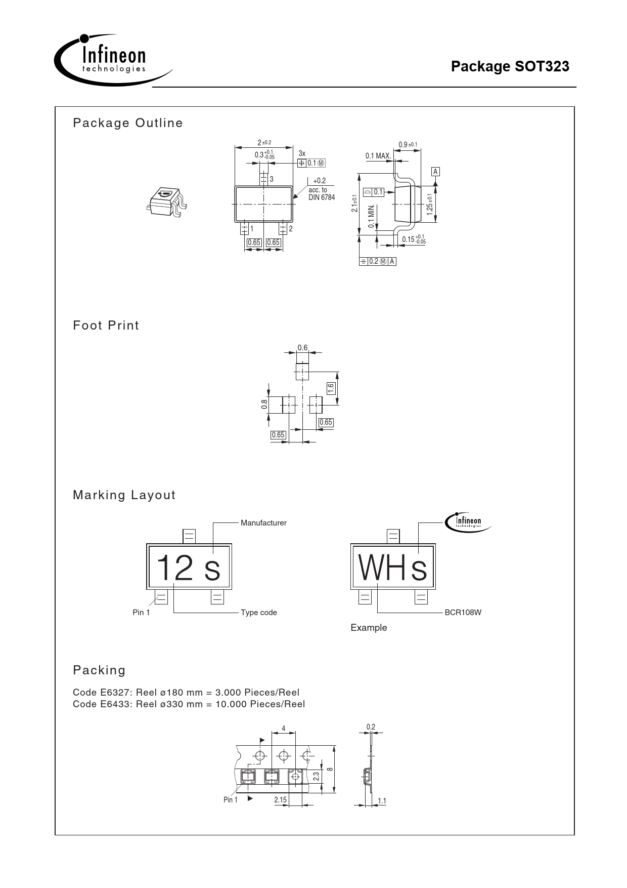 P a c k a g e O u t l i n e 2 ±0.2 0.9 ±0.1 0.3+0.1 3x -0.05 0.1 MAX. 0.1 M A 3 +0.2 acc. to 0.1 DIN 6784 ±0.1 ±0.1 2.1 1.25 0.1 MIN. 1 2 0.15 +0.1 -0.05 0.65 0.65 0.2 M A F o o t P r i n t 0.6 1.6 0.8 0.65 0.65 M a r k i n g L a y o u t Manufacturer Pin 1 Type code BCR108W Example P a c k i n g Code E6327: Reel ø180 mm = 3.000 Pieces/Reel Code E6433: Reel ø330 mm = 10.000 Pieces/Reel 0.2 4 8 2.3 Pin 1 2.15 1.1
