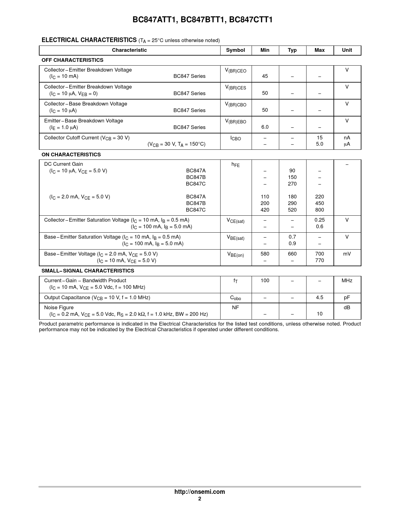 BC847ATT1, BC847BTT1, BC847CTT1. ELECTRICAL CHARACTERISTICS. Characteristic. Symbol. Min. Typ. Max. Unit. OFF CHARACTERISTICS
