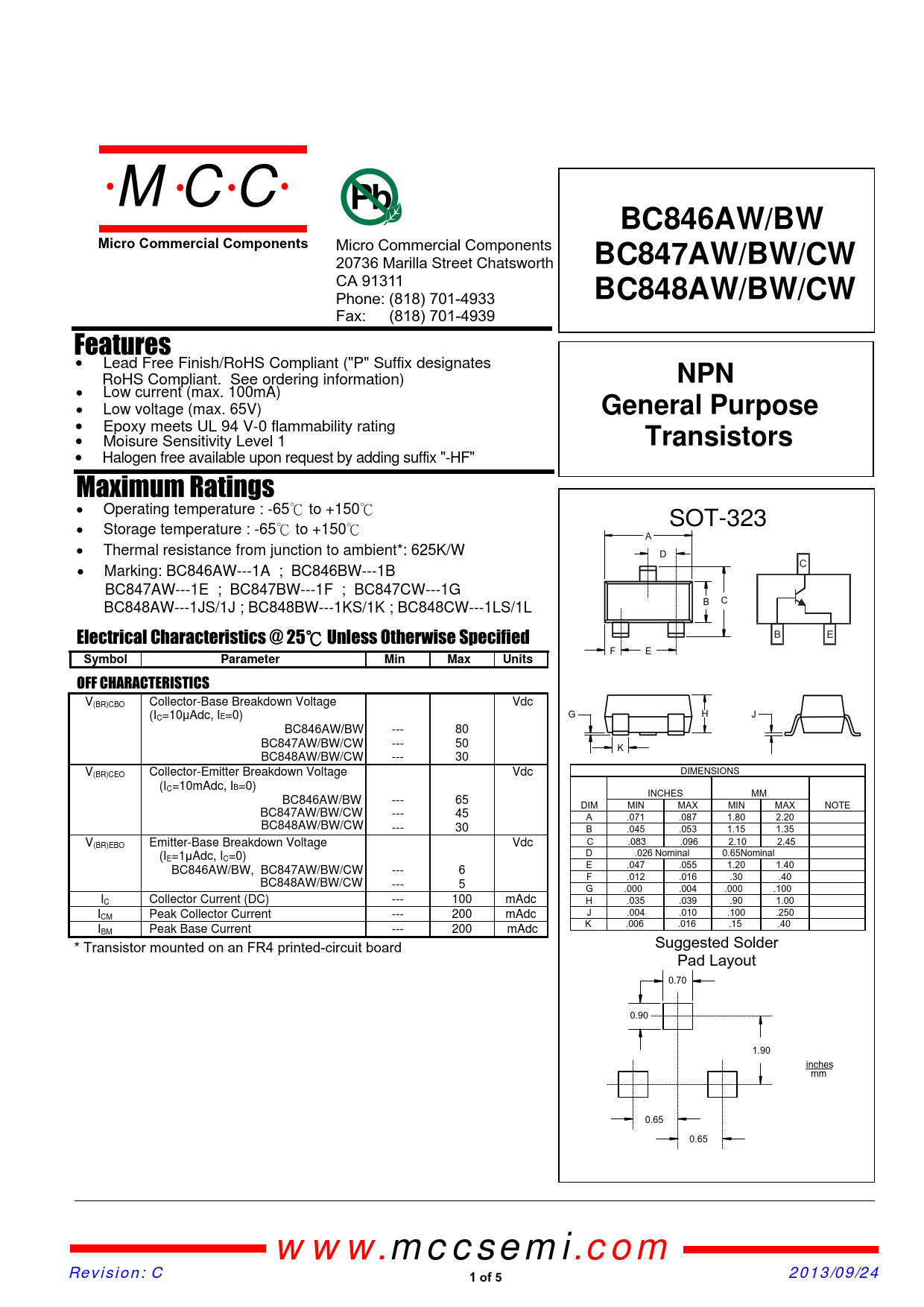 M C C BC846AW/BWMicro Commercial Components omponents 20736 Marilla Street Chatsworth BC847AW/BW/CW !"# BC848AW/BW/CW $ % !"# Features • Lead Free Finish/RoHS Compliant ("P" Suffix designates RoHS Compliant. See ordering information) NPN • Low current (max. 100mA) • Low voltage (max. 65V) General Purpose • Epoxy meets UL 94 V-0 flammability rating • Moisure Sensitivity Level 1 Transistors • Halogen free available upon request by adding suffix "-HF" Maximum Ratings • Operating temperature : -65к to +150к SOT-323 • Storage temperature : -65к to +150к A • Thermal resistance from junction to ambient*: 625K/W D C • Marking: BC846AW---1A ; BC846BW---1B BC847AW---1E ; BC847BW---1F ; BC847CW---1G C B BC848AW---1JS/1J ; BC848BW---1KS/1K ; BC848CW---1LS/1L B E Electrical Characteristics @ 25к Unless Otherwise Specified F E SymbolParameterMinMaxUnits OFF CHARACTERISTICS V(BR)CBO Collector-Base Breakdown Voltage Vdc (I G H C=10µAdc, IE=0) J BC846AW/BW --- 80 BC847AW/BW/CW --- 50 K BC848AW/BW/CW --- 30 V(BR)CEO Collector-Emitter Breakdown Voltage Vdc DIMENSIONS (IC=10 mAdc, IB=0) INCHES MM BC846AW/BW --- 65 DIM MIN MAX MIN MAX NOTE BC847AW/BW/CW --- 45 A .071 .087 1.80 2.20 BC848AW/BW/CW --- 30 B .045 .053 1.15 1.35 V(BR)EBO Emitter-Base Breakdown Voltage Vdc C .083 .096 2.10 2.45 (I D .026 Nominal 0.65Nominal E=1µAdc, IC=0) BC846AW/BW, BC847AW/BW/CW --- 6 E .047 .055 1.20 1.40 F .012 .016 .30 .40 BC848AW/BW/CW --- 5 G .000 .004 .000 .100 IC Collector Current (DC) --- 100 mAdc H .035 .039 .90 1.00 I J .004 .010 .100 .250 CM Peak Collector Current --- 200 mAdc I K .006 .016 .15 .40 BM Peak Base Current --- 200 mAdc Suggested Solder * Transistor mounted on an FR4 printed-circuit board Pad Layout 0.70 0.90 1.90 inches mm 0.65 0.65 www.mccsemi.com Revision: C 1 of 5 2013/09/24