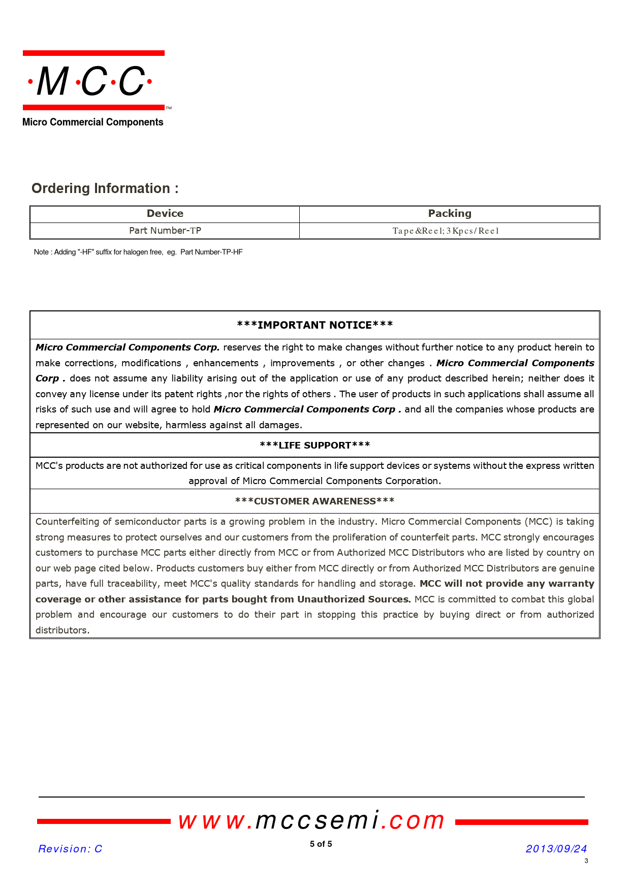 Micro Commercial Components Ordering Information : Device Packing ***IMPORTANT NOTICE*** Micro Commercial Components Corp
