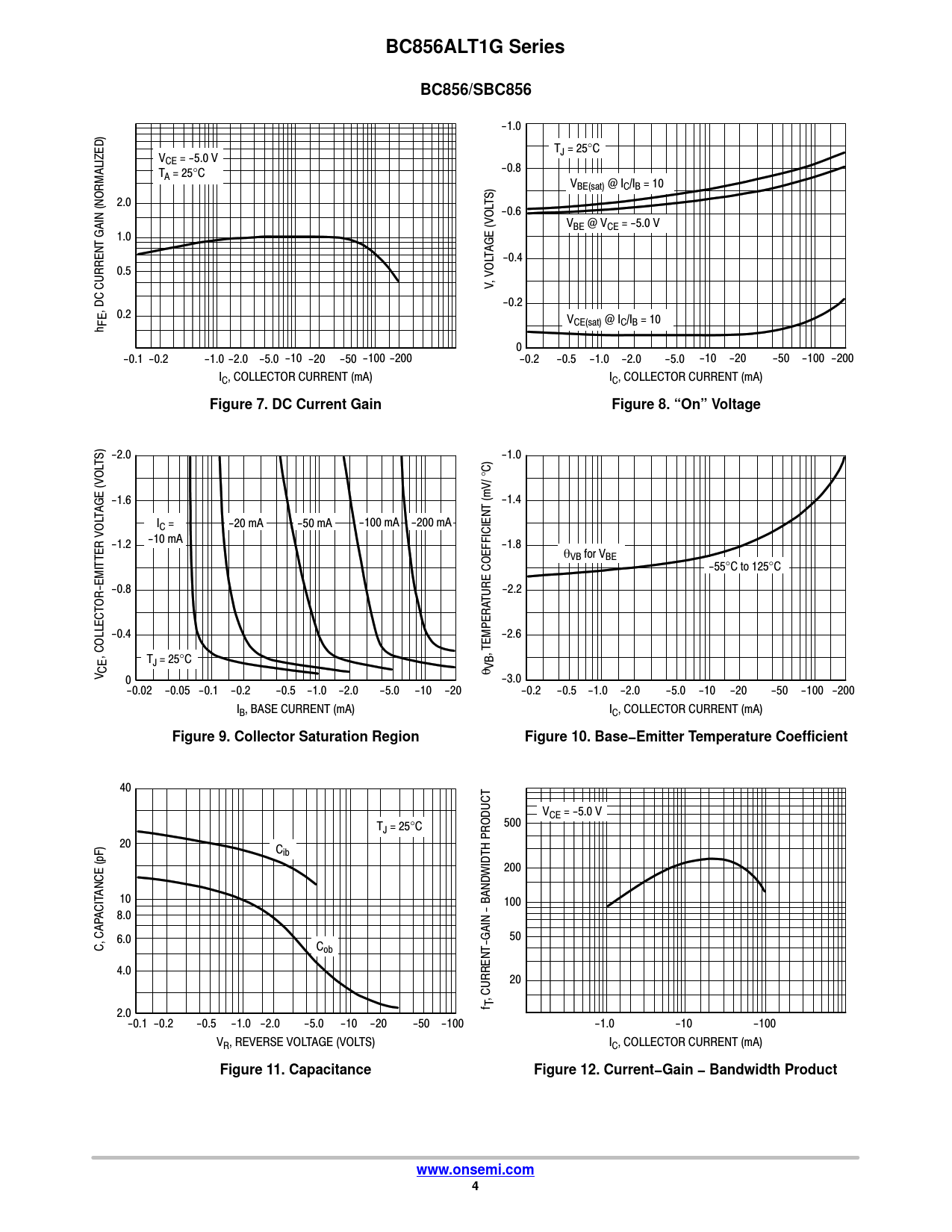 BC856ALT1G Series. BC856/SBC856. Figure 7. DC Current Gain. Figure 8. “On” Voltage. Figure 9. Collector Saturation Region