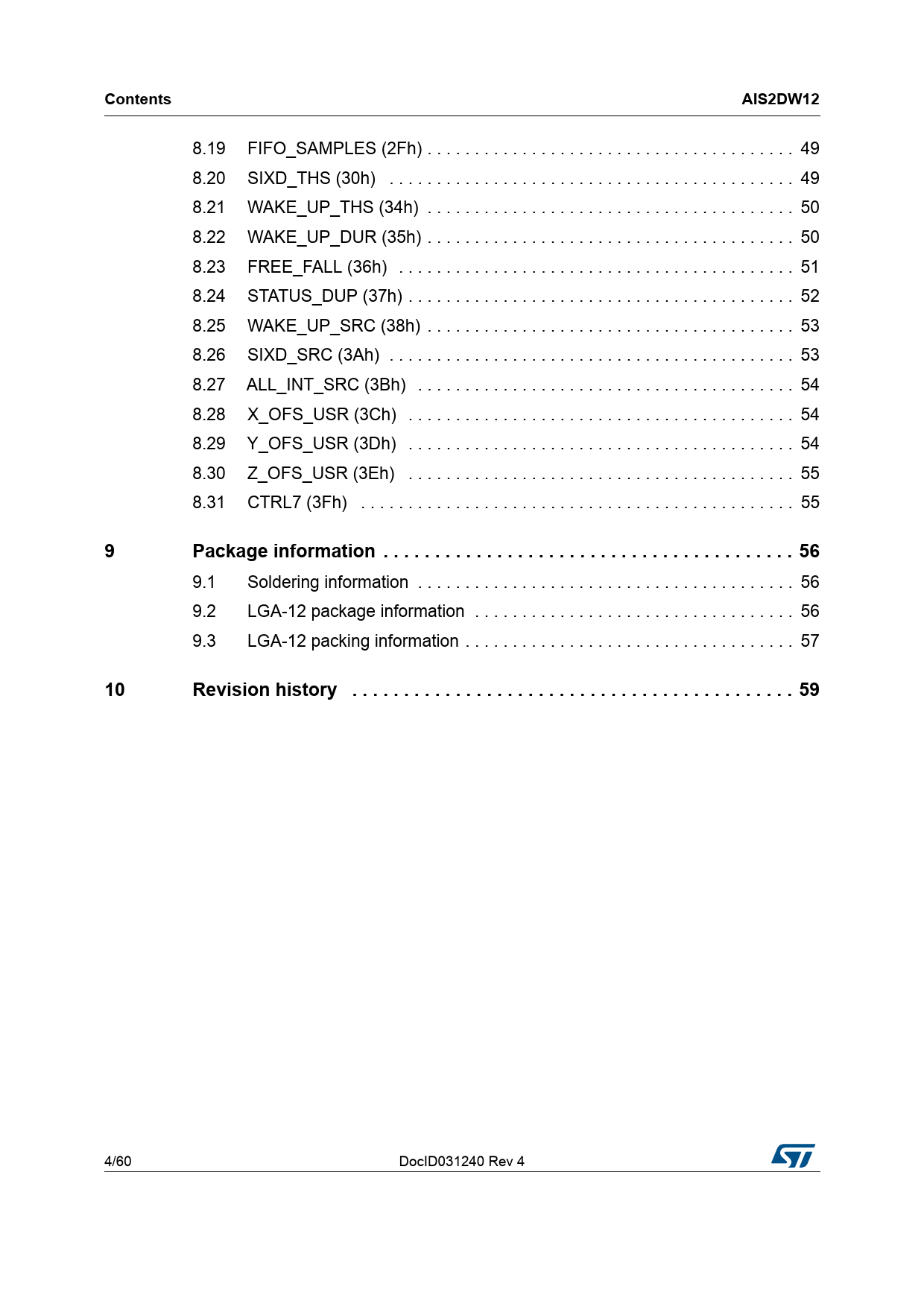 Contents. AIS2DW12. Package information . 56. Revision history . 59