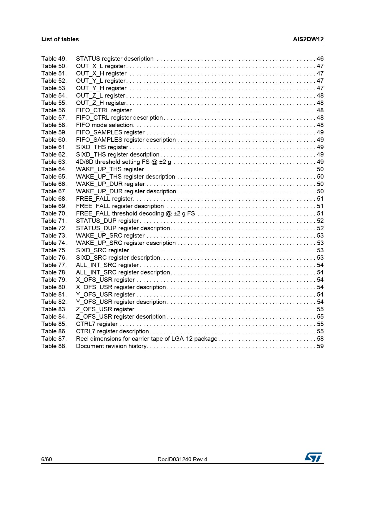 Table 49. STATUS register description . 46 Table 50. OUT_X_L register. 47 Table 51. OUT_X_H register . 47 Table 52. OUT_Y_L register. 47 Table 53. OUT_Y_H register . 47 Table 54. OUT_Z_L register . 48 Table 55. OUT_Z_H register. 48 Table 56. FIFO_CTRL register . 48 Table 57. FIFO_CTRL register description . 48 Table 58. FIFO mode selection. 48 Table 59. FIFO_SAMPLES register . 49 Table 60. FIFO_SAMPLES register description . 49 Table 61. SIXD_THS register . 49 Table 62. SIXD_THS register description . 49 Table 63. 4D/6D threshold setting FS @ ±2 g . 49 Table 64. WAKE_UP_THS register . 50 Table 65. WAKE_UP_THS register description . 50 Table 66. WAKE_UP_DUR register . 50 Table 67. WAKE_UP_DUR register description . 50 Table 68. FREE_FALL register. 51 Table 69. FREE_FALL register description . 51 Table 70. FREE_FALL threshold decoding @ ±2 g FS . 51 Table 71. STATUS_DUP register . 52 Table 72. STATUS_DUP register description. 52 Table 73. WAKE_UP_SRC register . 53 Table 74. WAKE_UP_SRC register description . 53 Table 75. SIXD_SRC register . 53 Table 76. SIXD_SRC register description. 53 Table 77. ALL_INT_SRC register . 54 Table 78. ALL_INT_SRC register description. 54 Table 79. X_OFS_USR register . 54 Table 80. X_OFS_USR register description . 54 Table 81. Y_OFS_USR register . 54 Table 82. Y_OFS_USR register description . 54 Table 83. Z_OFS_USR register . 55 Table 84. Z_OFS_USR register description . 55 Table 85. CTRL7 register . 55 Table 86. CTRL7 register description . 55 Table 87. Reel dimensions for carrier tape of LGA-12 package . 58 Table 88. Document revision history. 59 6/60 DocID031240 Rev 4 Document Outline Table 1. Device summary 1 Block diagram and pin description 1.1 Block diagram Figure 1. Block diagram 1.2 Pin description Figure 2. Pin connections Table 2. Pin description Table 3. Internal pull-up values (typ.) for SDO/SA0 and CS pins 2 Mechanical and electrical specifications 2.1 Mechanical characteristics Table 4. Mechanical characteristics @ Vdd = 3.0 V, T = -40°C to +85°C unless otherwise noted 2.2 Electrical characteristics Table 5. Electrical characteristics @ Vdd = 3.0 V, T = -40°C to +85°C unless otherwise noted 2.3 Temperature sensor characteristics Table 6. Temperature sensor characteristics 2.4 Communication interface characteristics 2.4.1 SPI - serial peripheral interface Table 7. SPI slave timing values Figure 3. SPI slave timing diagram 2.4.2 I²C - inter-IC control interface Table 8. I²C slave timing values Figure 4. I²C slave timing diagram Table 9. I²C high-speed mode specifications at 1 MHz and 3.4 MHz 2.5 Absolute maximum ratings Table 10. Absolute maximum ratings 3 Terminology and functionality 3.1 Terminology 3.1.1 Sensitivity 3.1.2 Zero-g level offset 3.2 Functionality 3.2.1 Operating modes Table 11. Operating modes 3.2.2 Single data conversion on-demand mode Figure 5. Single data conversion on demand functionality 3.2.3 Self-test 3.2.4 Activity/Inactivity, stationary/motion detection functions 3.2.5 Offset management 3.3 Sensing element 3.4 IC interface 3.5 Factory calibration 3.6 Temperature sensor 4 Application hints Figure 6. AIS2DW12 electrical connections (top view) Table 12. Internal pin status 5 Digital main blocks 5.1 Block diagram of filters Figure 7. Accelerometer chain 5.2 FIFO 5.2.1 Bypass mode 5.2.2 FIFO mode 5.2.3 Continuous mode 5.2.4 Continuous-to-FIFO mode Figure 8. Continuous-to-FIFO mode Figure 9. Trigger event to FIFO for Continuous-to-FIFO mode 5.2.5 Bypass-to-Continuous mode Figure 10. Bypass-to-Continuous mode Figure 11. Trigger event to FIFO for Bypass-to-Continuous mode 6 Digital interfaces Table 13. Serial interface pin description 6.1 I²C serial interface Table 14. I²C terminology 6.1.1 I2C operation Table 15. SAD+Read/Write patterns Table 16. Transfer when master is writing one byte to slave Table 17. Transfer when master is writing multiple bytes to slave Table 18. Transfer when master is receiving (reading) one byte of data from slave Table 19. Transfer when master is receiving (reading) multiple bytes of data from slave 6.2 SPI bus interface Figure 12. Read and write protocol 6.2.1 SPI read Figure 13. SPI read protocol Figure 14. Multiple byte SPI read protocol (2-byte example) 6.2.2 SPI write Figure 15. SPI write protocol Figure 16. Multiple byte SPI write protocol (2-byte example) 6.2.3 SPI read in 3-wire mode Figure 17. SPI read protocol in 3-wire mode 7 Register mapping Table 20. Register map 8 Register description 8.1 OUT_T_L (0Dh) Table 21. OUT_T_L register Table 22. OUT_T_L register description 8.2 OUT_T_H (0Eh) Table 23. OUT_T_H register Table 24. OUT_T_H register description 8.3 WHO_AM_I (0Fh) Table 25. WHO_AM_I register default values 8.4 CTRL1 (20h) Table 26. Control register 1 Table 27. Control register 1 description Table 28. Data rate configuration Table 29. Operating mode selection Table 30. Power mode selection 8.5 CTRL2 (21h) Table 31. Control register 2 Table 32. Control register 2 description 8.6 CTRL3 (22h) Table 33. Control register 3 Table 34. Control register 3 description Table 35. Self-test mode selection 8.7 CTRL4_INT1 (23h) Table 36. Control register 4 Table 37. Control register 4 description 8.8 CTRL5_INT2 (24h) Table 38. Control register 5 Table 39. Control register 5 description 8.9 CTRL6 (25h) Table 40. Control register 6 Table 41. Control register 6 description Table 42. Digital filtering cutoff selection (FDS bit set to ‘0’) Table 43. LPF1 cutoff (FDS bit set to '0') Table 44. Digital high-pass filter cutoff selection (FDS bit set to ‘1’) Table 45. Full-scale selection 8.10 OUT_T (26h) Table 46. OUT_T register Table 47. OUT_T register description 8.11 STATUS (27h) Table 48. STATUS register Table 49. STATUS register description 8.12 OUT_X_L (28h) Table 50. OUT_X_L register 8.13 OUT_X_H (29h) Table 51. OUT_X_H register 8.14 OUT_Y_L (2Ah) Table 52. OUT_Y_L register 8.15 OUT_Y_H (2Bh) Table 53. OUT_Y_H register 8.16 OUT_Z_L (2Ch) Table 54. OUT_Z_L register 8.17 OUT_Z_H (2Dh)