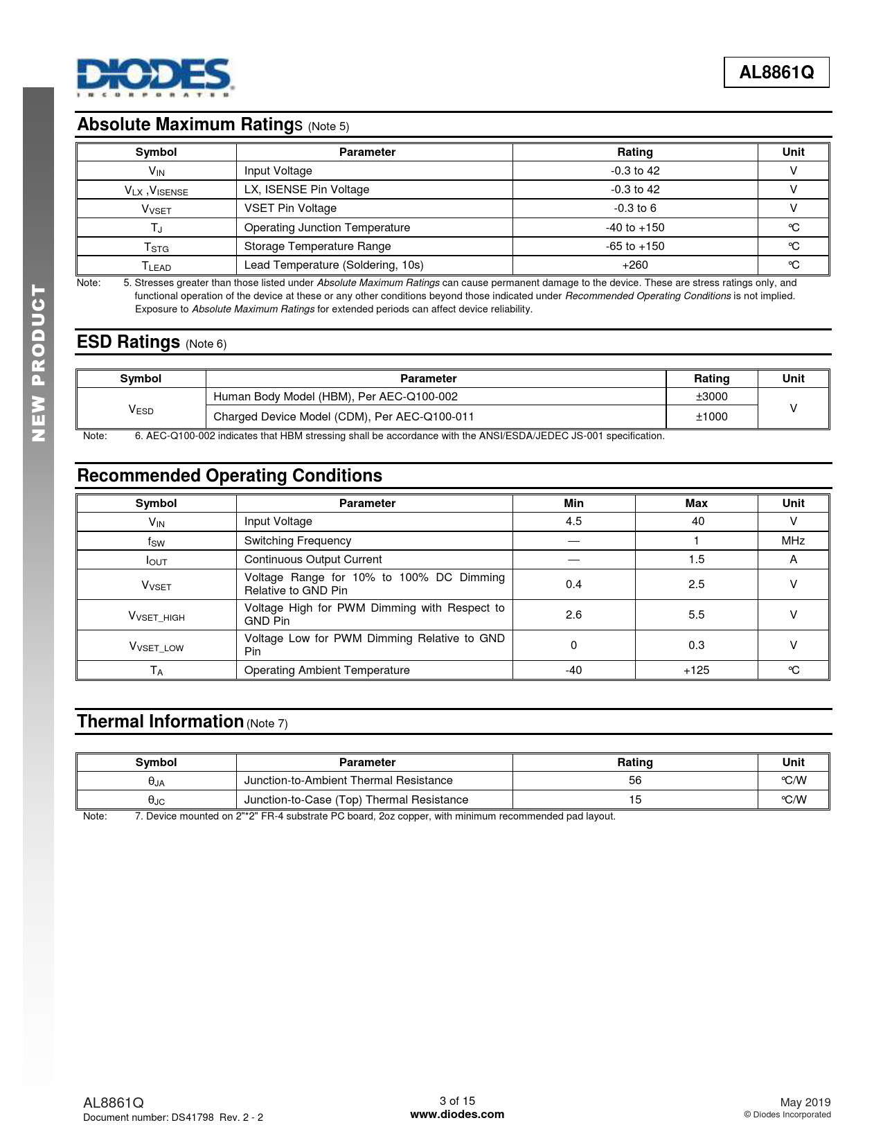 AL8861Q. Absolute Maximum Rating. Symbol. Parameter. Rating. Unit. D O. ESD Ratings. Recommended Operating Conditions. Min. Max