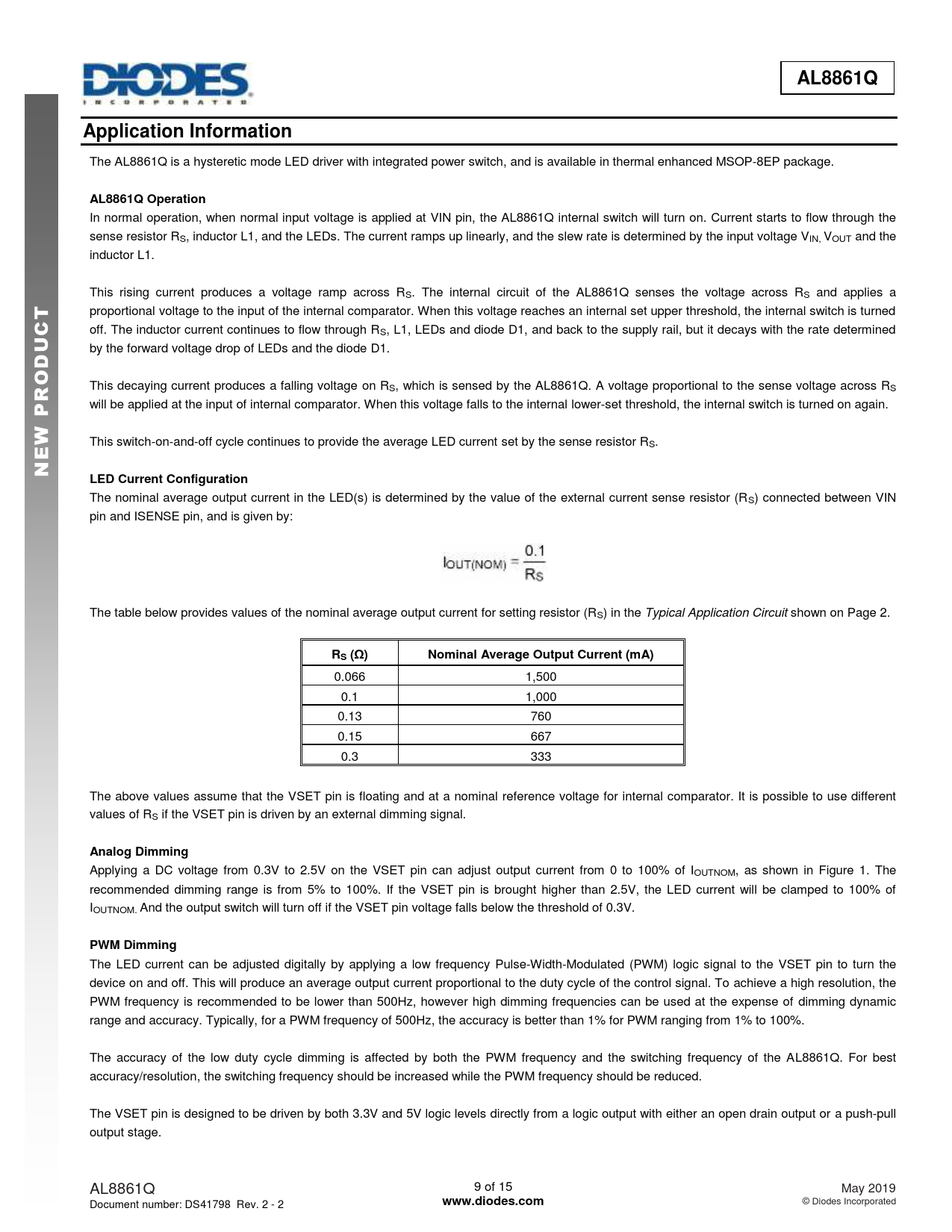 AL8861Q. Application Information. AL8861Q Operation. U D. W E. LED Current Configuration. RS (Ω). Nominal Average Output Current (mA)