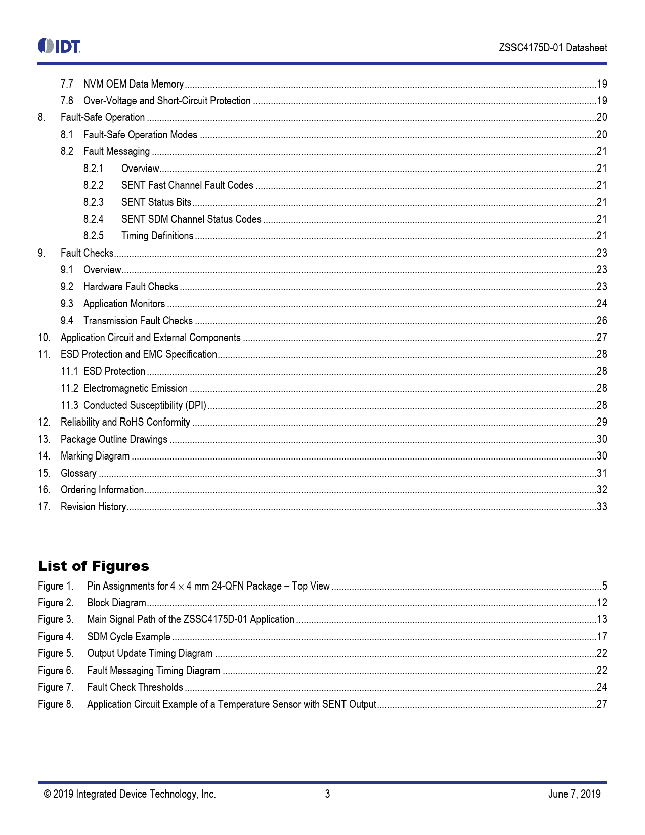 link to page 19 link to page 19 link to page 20 link to page 20 link to page 21 link to page 21 link to page 21 link to page 21 link to page 21 link to page 21 link to page 23 link to page 23 link to page 23 link to page 24 link to page 26 link to page 27 link to page 28 link to page 28 link to page 28 link to page 28 link to page 29 link to page 30 link to page 30 link to page 31 link to page 32 link to page 33 link to page 5 link to page 12 link to page 13 link to page 17 link to page 22 link to page 22 link to page 24 link to page 27 ZSSC4175D-01 Datasheet 7.7 NVM OEM Data Memory ...19 7.8 Over-Voltage and Short-Circuit Protection ..19 8. Fault-Safe Operation ..20 8.1 Fault-Safe Operation Modes ...20 8.2 Fault Messaging ..21 8.2.1 Overview ...21 8.2.2 SENT Fast Channel Fault Codes ...21 8.2.3 SENT Status Bits ..21 8.2.4 SENT SDM Channel Status Codes ..21 8.2.5 Timing Definitions ...21 9. Fault Checks ...23 9.1 Overview ..23 9.2 Hardware Fault Checks ...23 9.3 Application Monitors ..24 9.4 Transmission Fault Checks ...26 10. Application Circuit and External Components ..27 11. ESD Protection and EMC Specification ..28 11.1 ESD Protection ..28 11.2 Electromagnetic Emission ...28 11.3 Conducted Susceptibility (DPI) ..28 12. Reliability and RoHS Conformity ..29 13. Package Outline Drawings ...30 14. Marking Diagram ..30 15. Glossary ...31 16. Ordering Information ...32 17. Revision History ..33