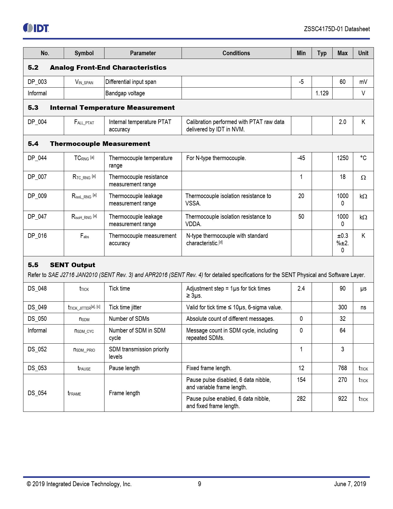 Refer to SAE J2716 JAN2010 (SENT Rev. 3) and APR2016 (SENT Rev. 4) for detailed specifications for the SENT Physical and Software Layer. DS_048 tTICK Tick time Adjustment step = 1µs for tick times 2.4 90 µs ≥ 3µs. DS_049 tTICK_JITTER[a], [c] Tick time jitter Valid for tick time ≤ 10µs, 6-sigma value. 300 ns DS_050 nSDM Number of SDMs Absolute count of different messages. 0 32 Informal nSDM_CYC Number of SDM in SDM Message count in SDM cycle, including 0 64 cycle repeated SDMs. DS_052 nSDM_PRIO SDM transmission priority 1 3 levels DS_053 tPAUSE Pause length Fixed frame length. 12 768 tTICK Pause pulse disabled, 6 data nibble, 154 270 tTICK and variable frame length. DS_054 tFRAME Frame length Pause pulse enabled, 6 data nibble, 282 922 tTICK and fixed frame length. © 2019 Integrated Device Technology, Inc. 9 June 7, 2019 Document Outline 1. Pin Assignments 2. Pin Descriptions 3. Absolute Maximum Ratings 4. Operating Conditions 5. Electrical Characteristics 6. Interface Characteristics and Nonvolatile Memory 7. Circuit Description 7.1 General Operation Description 7.2 Signal Path 7.3 Signal Conditioning 7.3.1 Thermocouple Sensor Signal Conditioning 7.3.2 Internal Temperature Sensor Signal Conditioning 7.4 Analog Front-End 7.4.1 Overview 7.4.2 SCCM 7.4.3 Input Multiplexer 7.4.4 Programmable Gain Amplifier 7.4.5 Analog-to-Digital Converter 7.5 Signal Measurement 7.5.1 Thermocouple Element Measurement 7.5.2 Internal Temperature Measurement 7.5.3 Isolation Conductance Measurement (Giso) 7.5.4 Thermocouple Resistor Measurement (Ropen) 7.5.5 Measurement Cycle 7.6 SENT Output 7.6.1 Overview 7.6.2 SENT Fast Channel Modes and Frame Format 7.6.3 SENT SDM Channel Modes 7.6.4 SENT Output Operation Modes 7.6.5 SENT Pulse Shaping 7.7 NVM OEM Data Memory 7.8 Over-Voltage and Short-Circuit Protection 8. Fault-Safe Operation 8.1 Fault-Safe Operation Modes 8.2 Fault Messaging 8.2.1 Overview 8.2.2 SENT Fast Channel Fault Codes 8.2.3 SENT Status Bits 8.2.4 SENT SDM Channel Status Codes 8.2.5 Timing Definitions 9. Fault Checks 9.1 Overview 9.2 Hardware Fault Checks 9.3 Application Monitors 9.4 Transmission Fault Checks 10. Application Circuit and External Components 11. ESD Protection and EMC Specification 11.1 ESD Protection 11.2 Electromagnetic Emission 11.3 Conducted Susceptibility (DPI) 12. Reliability and RoHS Conformity 13. Package Outline Drawings 14. Marking Diagram 15. Glossary 16. Ordering Information 17. Revision History