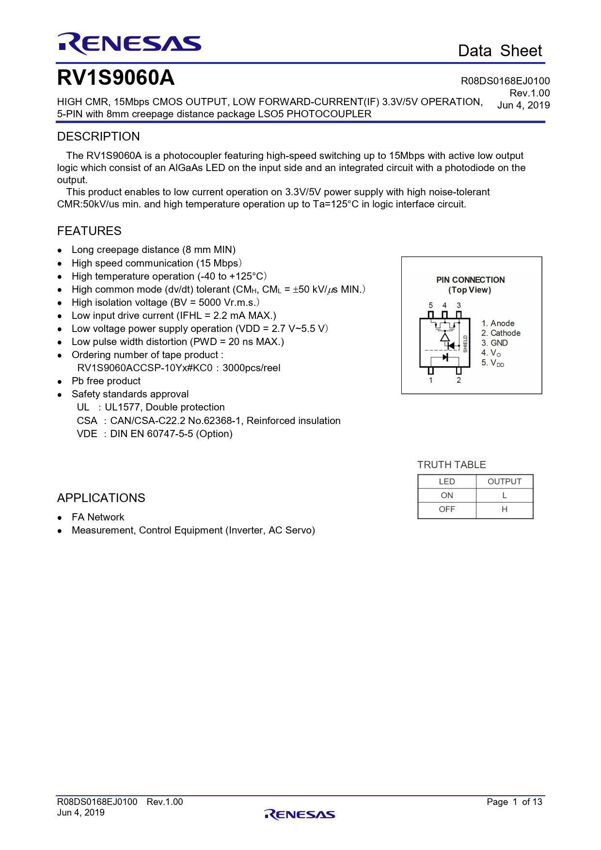 Data Sheet RV1S9060A R08DS0168EJ0100 Rev.1.00 HIGH CMR, 15Mbps CMOS OUTPUT, LOW FORWARD-CURRENT(IF) 3.3V/5V OPERATION, Jun 4, 2019 5-PIN with 8mm creepage distance package LSO5 PHOTOCOUPLER DESCRIPTION The RV1S9060A is a photocoupler featuring high-speed switching up to 15Mbps with active low output logic which consist of an AlGaAs LED on the input side and an integrated circuit with a photodiode on the output. This product enables to low current operation on 3.3V/5V power supply with high noise-tolerant CMR:50kV/us min. and high temperature operation up to Ta=125°C in logic interface circuit. FEATURES Long creepage distance (8 mm MIN) High speed communication (15 Mbps) High temperature operation (-40 to +125°C) High common mode (dv/dt) tolerant (CMH, CML = 50 kV/s MIN.) High isolation voltage (BV = 5000 Vr.m.s.) Low input drive current (IFHL = 2.2 mA MAX.) Low voltage power supply operation (VDD = 2.7 V~5.5 V) Low pulse width distortion (PWD = 20 ns MAX.) Ordering number of tape product : RV1S9060ACCSP-10Yx#KC0:3000pcs/reel Pb free product Safety standards approval UL :UL1577, Double protection CSA :CAN/CSA-C22.2 No.62368-1, Reinforced insulation VDE :DIN EN 60747-5-5 (Option) TRUTH TABLE APPLICATIONS FA Network Measurement, Control Equipment (Inverter, AC Servo) R08DS0168EJ0100 Rev.1.00 Page 1 of 13 Jun 4, 2019