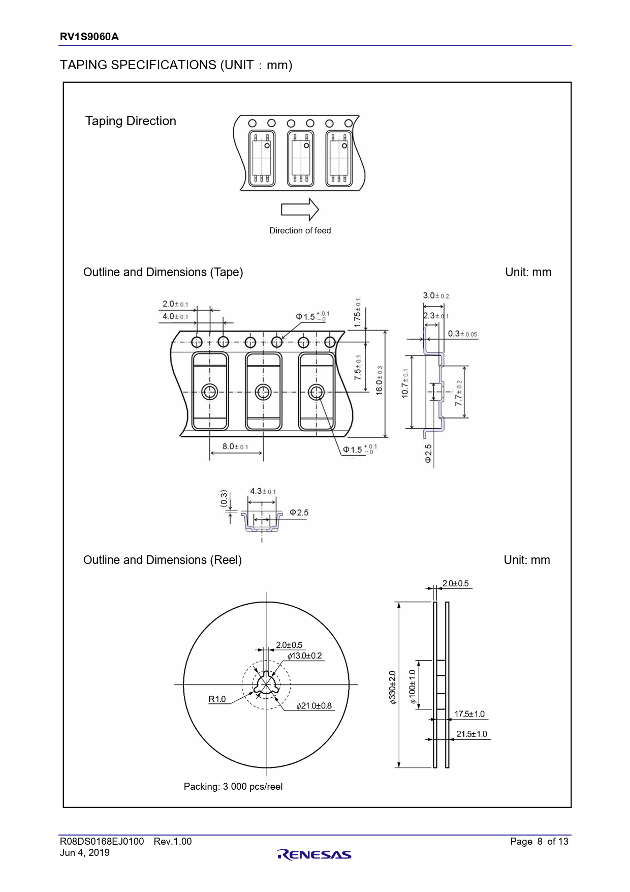 RV1S9060A 章題 TAPING SPECIFICATIONS (UNIT:mm) Taping Direction Direction of feed Outline and Dimensions (Tape) Unit: mm Outline and Dimensions (Reel) Unit: mm Packing: 3 000 pcs/reel R08DS0168EJ0100 Rev.1.00 Page 8 of 13 Jun 4, 2019