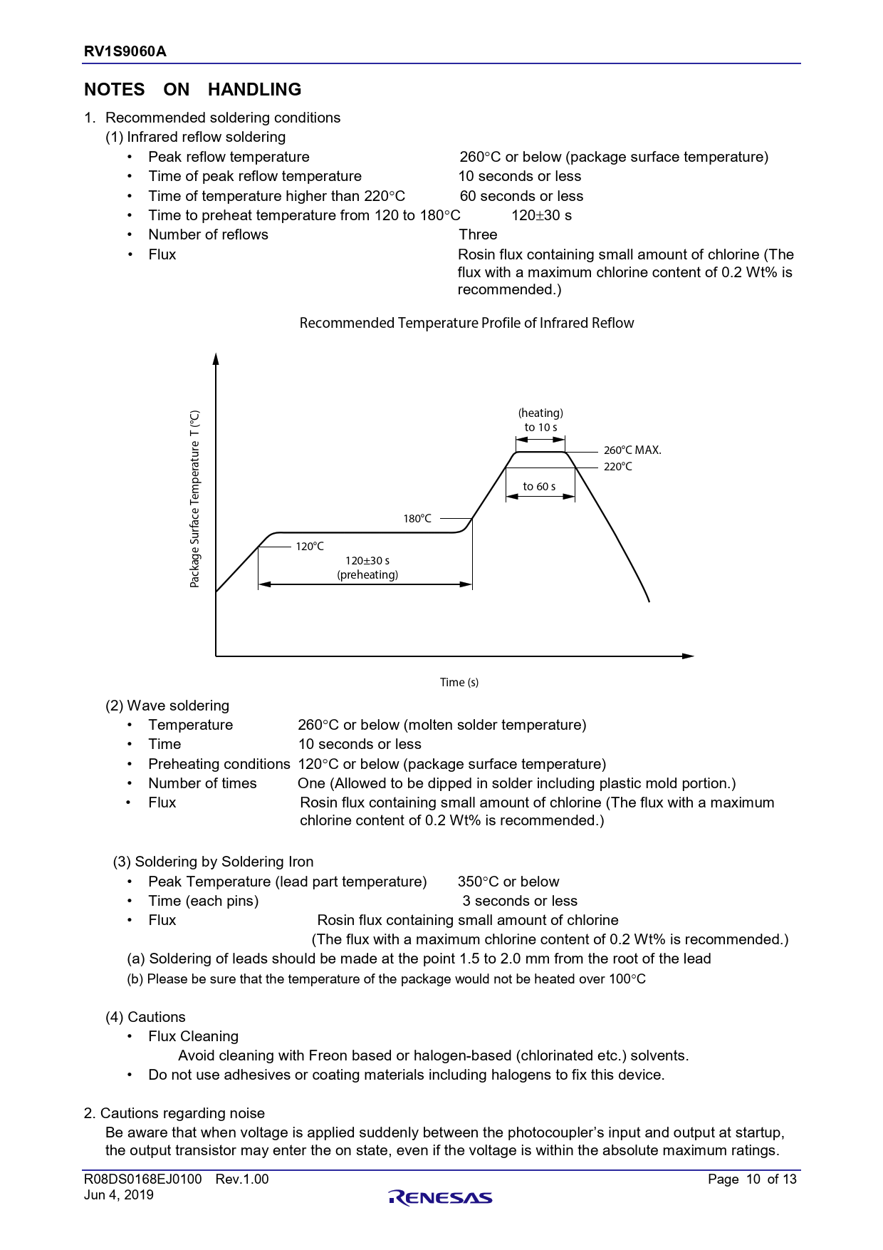 RV1S9060A 章題 NOTES ON HANDLING 1. Recommended soldering conditions (1) Infrared reflow soldering • Peak reflow temperature 260C or below (package surface temperature) • Time of peak reflow temperature 10 seconds or less • Time of temperature higher than 220C 60 seconds or less • Time to preheat temperature from 120 to 180C 12030 s • Number of reflows Three • Flux Rosin flux containing smal amount of chlorine (The flux with a maximum chlorine content of 0.2 Wt% is recommended.) Recommended Temperature Profile of Infrared Reflow ) (heating) to 10 s re T (°C 260°C MAX. ratu 220°C e p to 60 s em T 180°C rface e Su 120°C 120±30 s ackag (preheating) P Time (s) (2) Wave soldering • Temperature 260C or below (molten solder temperature) • Time 10 seconds or less • Preheating conditions 120C or below (package surface temperature) • Number of times One (Al owed to be dipped in solder including plastic mold portion.) • Flux Rosin flux containing smal amount of chlorine (The flux with a maximum chlorine content of 0.2 Wt% is recommended.) (3) Soldering by Soldering Iron • Peak Temperature (lead part temperature) 350C or below • Time (each pins) 3 seconds or less • Flux Rosin flux containing smal amount of chlorine (The flux with a maximum chlorine content of 0.2 Wt% is recommended.) (a) Soldering of leads should be made at the point 1.5 to 2.0 mm from the root of the lead (b) Please be sure that the temperature of the package would not be heated over 100C (4) Cautions • Flux Cleaning Avoid cleaning with Freon based or halogen-based (chlorinated etc.) solvents. • Do not use adhesives or coating materials including halogens to fix this device. 2. Cautions regarding noise Be aware that when voltage is applied suddenly between the photocoupler’s input and output at startup, the output transistor may enter the on state, even if the voltage is within the absolute maximum ratings. R08DS0168EJ0100 Rev.1.00 Page 10 of 13 Jun 4, 2019