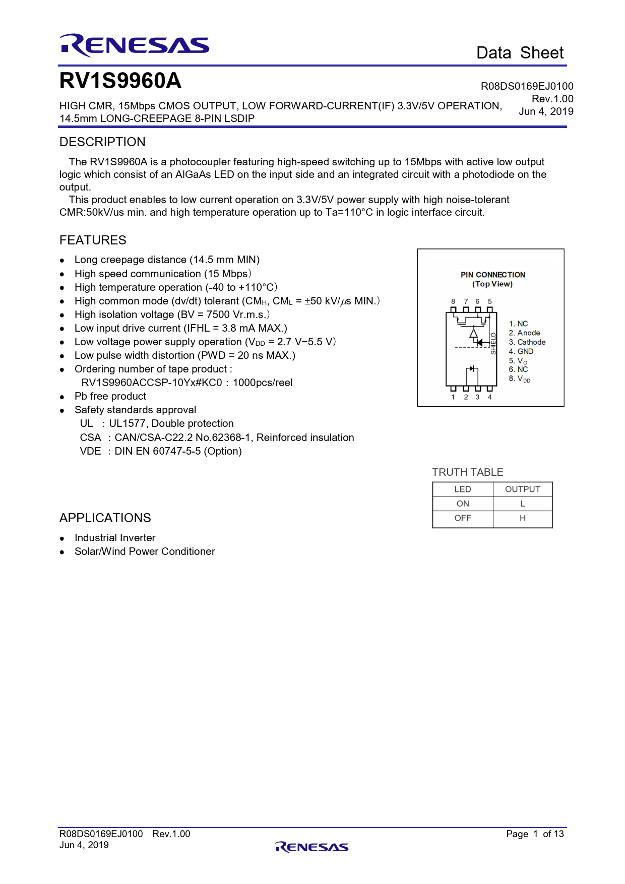 Data. Sheet. RV1S9960A. R08DS0169EJ0100. Rev.1.00. HIGH. CMR,. 15Mbps. CMOS. OUTPUT,. LOW. FORWARD-CURRENT(IF). 3.3V/5V. OPERATION,. Jun. 4,. 2019