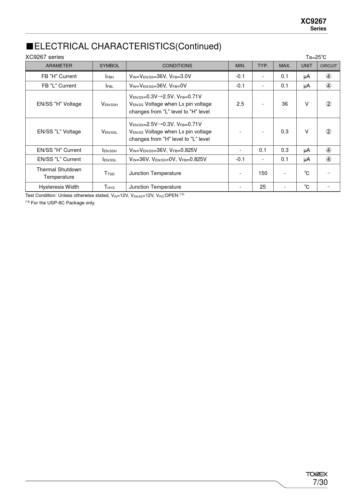 XC9267Series ■ELECTRICAL CHARACTERISTICS(Continued) XC9267 series Ta=25℃ ARAMETER SYMBOL CONDITIONS MIN. TYP. MAX. UNIT CIRCUIT FB "H" Current IFBH VIN=VEN/SS=36V, VFB=3.0V -0.1 - 0.1 μA ④ FB "L" Current IFBL VIN=VEN/SS=36V, VFB=0V -0.1 - 0.1 μA ④ VEN/SS=0.3V→2.5V, VFB=0.71V EN/SS "H" Voltage VEN/SSH VEN/SS Voltage when Lx pin voltage 2.5 - 36 V ② changes from "L" level to "H" level VEN/SS=2.5V→0.3V, VFB=0.71V EN/SS "L" Voltage VEN/SSL VEN/SS Voltage when Lx pin voltage - - 0.3 V ② changes from "H" level to "L" level EN/SS "H" Current IEN/SSH VIN=VEN/SS=36V, VFB=0.825V - 0.1 0.3 μA ④ EN/SS "L" Current IEN/SSL VIN=36V, VEN/SS=0V, VFB=0.825V -0.1 - 0.1 μA ④ Thermal Shutdown TTSD Junction Temperature - 150 - ℃ - Temperature Hysteresis Width THYS Junction Temperature - 25 - ℃ - Test Condition: Unless otherwise stated, VIN=12V, VEN/SS=12V, VPG:OPEN (*4) (*4) For the USP-6C Package only. 7/30