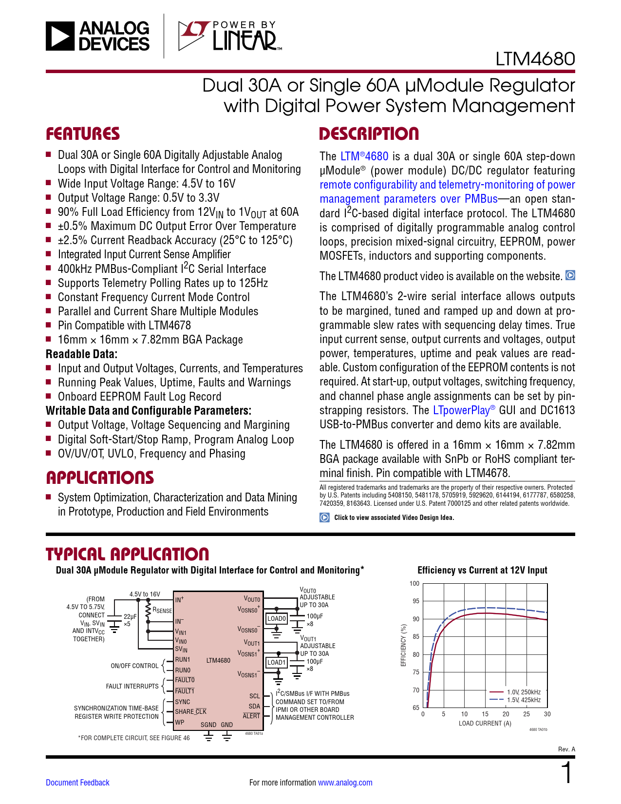 LTM4680 Dual 30A or Single 60A µModule Regulator with Digital Power System Management FEATURESDESCRIPTION n Dual 30A or Single 60A Digitally Adjustable Analog The LTM®4680 is a dual 30A or single 60A step-down Loops with Digital Interface for Control and Monitoring µModule® (power module) DC/DC regulator featuring n Wide Input Voltage Range: 4.5V to 16V remote configurability and telemetry-monitoring of power n Output Voltage Range: 0.5V to 3.3V management parameters over PMBus—an open stan- n 90% Full Load Efficiency from 12VIN to 1VOUT at 60A dard I2C-based digital interface protocol. The LTM4680 n ±0.5% Maximum DC Output Error Over Temperature is comprised of digitally programmable analog control n ±2.5% Current Readback Accuracy (25°C to 125°C) loops, precision mixed-signal circuitry, EEPROM, power n Integrated Input Current Sense Amplifier MOSFETs, inductors and supporting components. n 400kHz PMBus-Compliant I2C Serial Interface The LTM4680 product video is available on the website. n Supports Telemetry Polling Rates up to 125Hz n Constant Frequency Current Mode Control The LTM4680’s 2-wire serial interface al ows outputs n Parallel and Current Share Multiple Modules to be margined, tuned and ramped up and down at pro- n Pin Compatible with LTM4678 grammable slew rates with sequencing delay times. True n 16mm × 16mm × 7.82mm BGA Package input current sense, output currents and voltages, output Readable Data: power, temperatures, uptime and peak values are read- n Input and Output Voltages, Currents, and Temperatures able. Custom configuration of the EEPROM contents is not n Running Peak Values, Uptime, Faults and Warnings required. At start-up, output voltages, switching frequency, n Onboard EEPROM Fault Log Record and channel phase angle assignments can be set by pin- Writable Data and Configurable Parameters: strapping resistors. The LTpowerPlay® GUI and DC1613 n Output Voltage, Voltage Sequencing and Margining USB-to-PMBus converter and demo kits are available. n Digital Soft-Start/Stop Ramp, Program Analog Loop The LTM4680 is offered in a 16mm × 16mm × 7.82mm n OV/UV/OT, UVLO, Frequency and Phasing BGA package available with SnPb or RoHS compliant ter- minal finish. Pin compatible with LTM4678. APPLICATIONS All registered trademarks and trademarks are the property of their respective owners. Protected n System Optimization, Characterization and Data Mining by U.S. Patents including 5408150, 5481178, 5705919, 5929620, 6144194, 6177787, 6580258, 7420359, 8163643. Licensed under U.S. Patent 7000125 and other related patents worldwide. in Prototype, Production and Field Environments Click to view associated Video Design Idea.TYPICAL APPLICATIONDual 30A µModule Regulator with Digital Interface for Control and Monitoring*Efficiency vs Current at 12V Input 100 V 4.5V to 16V OUT0 (FROM V IN+ OUT0 ADJUSTABLE 95 4.5V TO 5.75V, UP TO 30A R + SENSE VOSNS0 CONNECT 22µF 100µF LOAD0 90 VIN, SVIN ×5 IN– ×8 V – AND INTVCC V OSNS0 IN1 V 85 TOGETHER) VIN0 V OUT1 OUT1 SV ADJUSTABLE IN V + OSNS1 UP TO 30A 80 RUN1 LTM4680 LOAD1 100µF ON/OFF CONTROL EFFICIENCY (%) RUN0 ×8 V – 75 OSNS1 FAULT0 FAULT INTERRUPTS FAULT1 70 I2C/SMBus I/F WITH PMBus 1.0V, 250kHz SCL 1.5V, 425kHz SYNC COMMAND SET TO/FROM SDA SYNCHRONIZATION TIME-BASE 65 SHARE_CLK IPMI OR OTHER BOARD 0 5 10 15 20 25 30 REGISTER WRITE PROTECTION ALERT MANAGEMENT CONTROLLER WP SGND GND LOAD CURRENT (A) 4680 TA01b 4680 TA01a *FOR COMPLETE CIRCUIT, SEE FIGURE 46 Rev. A Document Feedback For more information www.analog.com 1 Document Outline Features Applications Typical Application Description Table of Contents Absolute Maximum Ratings Order Information Pin Configuration Electrical Characteristics Typical Performance Characteristics Pin Functions Simplified Block Diagram Decoupling Requirements Functional Diagram Test Circuits Operation Power Module Introduction Power Module Overview, Major Features EEPROM with ECC Power-Up and Initialization Soft-Start Time-Based Sequencing Voltage-Based Sequencing Shutdown Light-Load Current Operation Switching Frequency and Phase PWM Loop Compensation Output Voltage Sensing INTVCC/EXTVCC Power Output Current Sensing and Sub Milliohm DCR Current Sensing Input Current Sensing PolyPhase Load Sharing External/Internal Temperature Sense RCONFIG (Resistor Configuration) Pins Table 1. VOUTn_CFG Pin Strapping Look-Up Table for the LTM4680’s Output Voltage, Coarse Setting (Not Applicable if MFR_CONFIG_ALL[6] = 1b) Table 2. VTRIMn_CFG Pin Strapping Look-Up Table for the LTM4680’s Output Voltage, Fine Adjustment Setting (Not Applicable if MFR_CONFIG_ALL[6] = 1b) Table 3. FSWPH_CFG Pin Strapping Look-Up Table to Set the LTM4680’s Switching Frequency and Channel Phase-Interleaving Angle (Not Applicable if MFR_CONFIG_ALL[6] = 1b) Table 4. ASEL Pin Strapping Look-Up Table to Set the LTM4680’s Slave Address (Applicable Regardless of MFR_CONFIG_ALL[6] Setting) Table 5. LTM4680 MFR_ADDRESS Command Examples Expressed in 7- and 8-Bit Addressing Fault Detection and Handling Status Registers and ALERT Masking Figure 5. LTM4680 Status Register Summary Mapping Faults to FAULT Pins Power Good Pins CRC Protection Serial Interface Communication Protection Device Addressing Responses to VOUT and IIN/IOUT Faults Output Overvoltage Fault Response Output Undervoltage Response Peak Output Overcurrent Fault Response Responses to Timing Faults Responses to VIN OV Faults Responses to OT/UT Faults Internal Overtemperature Fault Response External Overtemperature and Undertemperature Fault Response Responses to Input Overcurrent and Output Undercurrent Faults Responses to External Faults Fault Logging Bus Timeout Protection Similarity Between PMBus, SMBus and I2C 2-Wire Interface PMBus Serial Digital Interface Table 6. Abbreviations of Supported Data Formats Figure 6. PMBus Timing Diagram Figures 7 to 24 PMBus Protocols PMBus Command Summary PMBus Commands Table 7. PMBus Commands Summary (Note: The Data Format