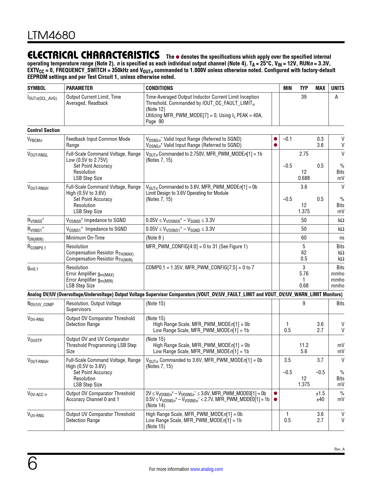 link to page 90 link to page 11 LTM4680 ELECTRICAL CHARACTERISTICSThe l denotes the specifications which apply over the specified internaloperating temperature range (Note 2). nis specified as each individual output channel (Note 4). TA = 25°C, VIN = 12V, RUNn= 3.3V,EXTVCC = 0, FREQUENCY_SWITCH = 350kHz and VOUTncommanded to 1.000V unless otherwise noted. Configured with factory-defaultEEPROM settings and per Test Circuit 1, unless otherwise noted.SYMBOLPARAMETERCONDITIONSMINTYPMAX UNITS IOUTn(OCL_AVG) Output Current Limit, Time Time-Averaged Output Inductor Current Limit Inception 39 A Averaged, Readback Threshold, Commanded by IOUT_OC_FAULT_LIMITn (Note 12) Utilizing MFR_PWM_MODE[7] = 0, Using IL PEAK = 40A, Page 90 Control Section V – FBCMn Feedback Input Common Mode VOSNSn Valid Input Range (Referred to SGND) l –0.1 0.3 V Range V + OSNSn Valid Input Range (Referred to SGND) l 3.6 V VOUT-RNGL Full-Scale Command Voltage, Range VOUTn Commanded to 2.750V, MFR_PWM_MODEn[1] = 1b 2.75 V Low (0.5V to 2.75V) (Notes 7, 15) Set Point Accuracy −0.5 0.5 % Resolution 12 Bits LSB Step Size 0.688 mV VOUT-RNGH Full-Scale Command Voltage, Range VOUTn Commanded to 3.6V, MFR_PWM_MODEn[1] = 0b 3.6 V High (0.5V to 3.6V) Limit Design to 3.6V Operating for Module Set Point Accuracy (Notes 7, 15) –0.5 0.5 % Resolution 12 Bits LSB Step Size 1.375 mV R + + + VSNS0 VOSNS0 Impedance to SGND 0.05V ≤ VVOSNS0 – VSGND ≤ 3.3V 50 kΩ R + + + VSNS1 VOSNS1 Impedance to SGND 0.05V ≤ VVOSNS1 – VSGND ≤ 3.3V 50 kΩ tON(MIN) Minimum On-Time (Note 8 ) 60 ns RCOMP0,1 Resolution MFR_PWM_CONFIG[4:0] = 0 to 31 (See Figure 1) 5 Bits Compensation Resistor RTH(MAX) 62 kΩ Compensation Resistor RTH(MIN) 0.5 kΩ gm0,1 Resolution COMP0,1 = 1.35V, MFR_PWM_CONFIG[7:5] = 0 to 7 3 Bits Error Amplifier gm(MAX) 5.76 mmho Error Amplifier gm(MIN) 1 mmho LSB Step Size 0.68 mmho Analog OV/UV (Overvoltage/Undervoltage) Output Voltage Supervisor Comparators (VOUT_OV/UV_FAULT_LIMIT and VOUT_OV/UV_WARN_LIMIT Monitors) NOV/UV_COMP Resolution, Output Voltage (Note 15) 9 Bits Supervisors VOV-RNG Output OV Comparator Threshold (Note 15) Detection Range High Range Scale, MFR_PWM_MODEn[1] = 0b 1 3.6 V Low Range Scale, MFR_PWM_MODEn[1] = 1b 0.5 2.7 V VOUSTP Output OV and UV Comparator (Note 15) Threshold Programming LSB Step High Range Scale, MFR_PWM_MODEn[1] = 0b 11.2 mV Size Low Range Scale, MFR_PWM_MODEn[1] = 1b 5.6 mV VOUT-RNGH Full-Scale Command Voltage, Range VOUTn Commanded to 3.6V, MFR_PWM_MODEn[1] = 0b 3.5 3.7 V High (0.5V to 3.6V) (Notes 7, 15) Set Point Accuracy –0.5 –0.5 % Resolution 12 Bits LSB Step Size 1.375 mV V + – OV-ACC-n Output OV Comparator Threshold 2V ≤ VVOSNSn – VVOSNSn ≤ 3.6V, MFR_PWM_MODE0[1] = 0b l ±1.5 % Accuracy Channel 0 and 1 0.5V ≤ V + – VOSNSn – VVOSNSn < 2.7V, MFR_PWM_MODE0[1] = 1b l ±40 mV (Note 14) VUV-RNG Output UV Comparator Threshold High Range Scale, MFR_PWM_MODEn[1] = 0b 1 3.6 V Detection Range Low Range Scale, MFR_PWM_MODEn[1] = 1b 0.5 2.7 V (Note 15) Rev. A 6 For more information www.analog.com Document Outline Features Applications Typical Application Description Table of Contents Absolute Maximum Ratings Order Information Pin Configuration Electrical Characteristics Typical Performance Characteristics Pin Functions Simplified Block Diagram Decoupling Requirements Functional Diagram Test Circuits Operation Power Module Introduction Power Module Overview, Major Features EEPROM with ECC Power-Up and Initialization Soft-Start Time-Based Sequencing Voltage-Based Sequencing Shutdown Light-Load Current Operation Switching Frequency and Phase PWM Loop Compensation Output Voltage Sensing INTVCC/EXTVCC Power Output Current Sensing and Sub Milliohm DCR Current Sensing Input Current Sensing PolyPhase Load Sharing External/Internal Temperature Sense RCONFIG (Resistor Configuration) Pins Table 1. VOUTn_CFG Pin Strapping Look-Up Table for the LTM4680’s Output Voltage, Coarse Setting (Not Applicable if MFR_CONFIG_ALL[6] = 1b) Table 2. VTRIMn_CFG Pin Strapping Look-Up Table for the LTM4680’s Output Voltage, Fine Adjustment Setting (Not Applicable if MFR_CONFIG_ALL[6] = 1b) Table 3. FSWPH_CFG Pin Strapping Look-Up Table to Set the LTM4680’s Switching Frequency and Channel Phase-Interleaving Angle (Not Applicable if MFR_CONFIG_ALL[6] = 1b) Table 4. ASEL Pin Strapping Look-Up Table to Set the LTM4680’s Slave Address (Applicable Regardless of MFR_CONFIG_ALL[6] Setting) Table 5. LTM4680 MFR_ADDRESS Command Examples Expressed in 7- and 8-Bit Addressing Fault Detection and Handling Status Registers and ALERT Masking Figure 5. LTM4680 Status Register Summary Mapping Faults to FAULT Pins Power Good Pins CRC Protection Serial Interface Communication Protection Device Addressing Responses to VOUT and IIN/IOUT Faults Output Overvoltage Fault Response Output Undervoltage Response Peak Output Overcurrent Fault Response Responses to Timing Faults Responses to VIN OV Faults Responses to OT/UT Faults Internal Overtemperature Fault Response External Overtemperature and Undertemperature Fault Response Responses to Input Overcurrent and Output Undercurrent Faults Responses to External Faults Fault Logging Bus Timeout Protection Similarity Between PMBus, SMBus and I2C 2-Wire Interface PMBus Serial Digital Interface Table 6. Abbreviations of Supported Data Formats Figure 6. PMBus Timing Diagram Figures 7 to 24 PMBus Protocols PMBus Command Summary PMBus Commands Table 7. PMBus Commands Summary (Note: The Data Format Abbreviations Are Detailed in Table 8) Table 8. Data Format Abbreviations Applications Information VIN to VOUT Step-Down Ratios Input Capacitors Output Capacitors Light Load Current Operation Switching Frequency and Phase Output Current Limit Programming Minimum On-Time Considerations Variable Delay Time, Soft-Start and Output Voltage Ramping Digital Servo Mode Soft Off (Sequenced Off) Undervoltage Lockout Fault Detection and Handling Open-Drain Pins Phase-Locked Loop and Frequency Synchron