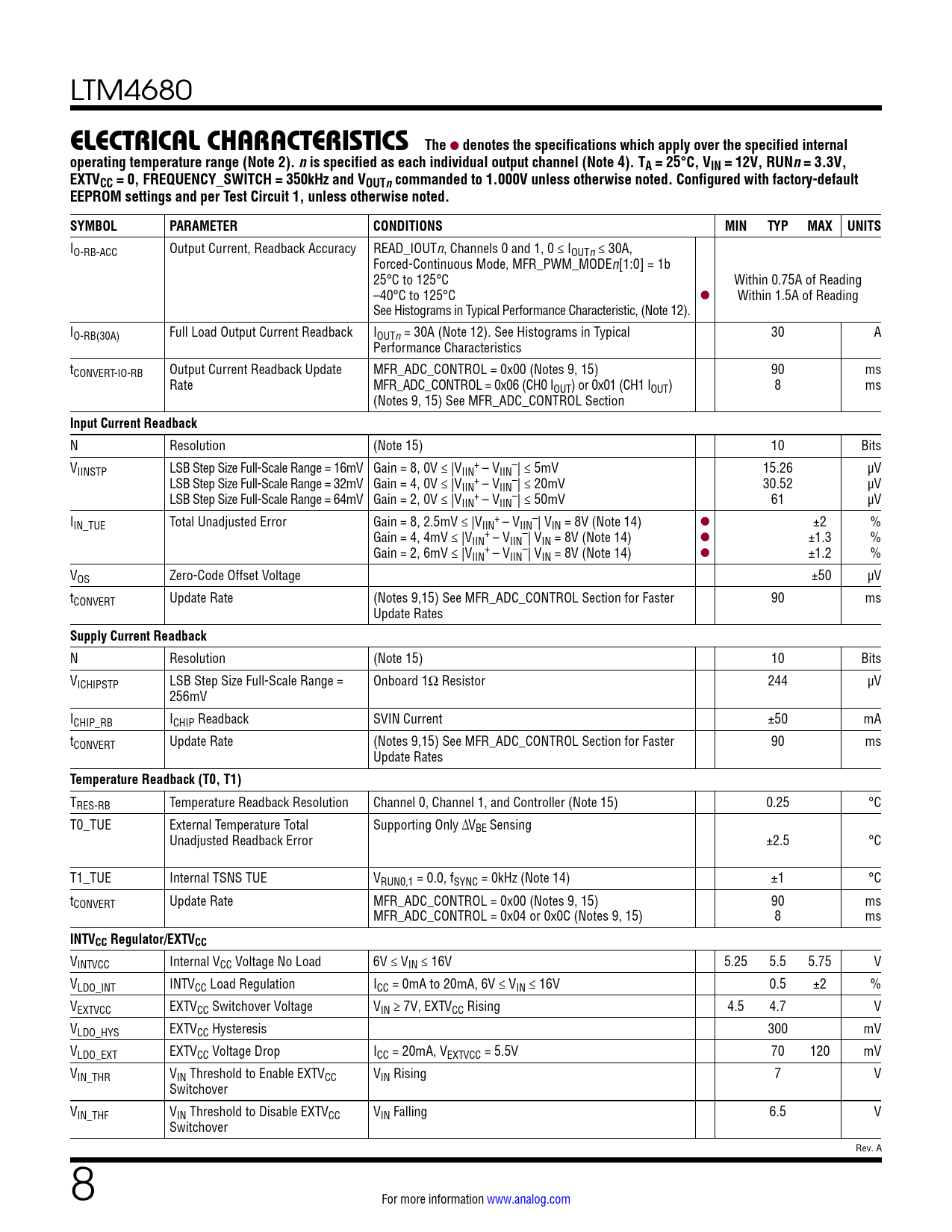 denotes the specifications which apply over the specified internal operating temperature range (Note 2). n is specified as each individual output channel (Note 4). TA = 25°C, VIN = 12V, RUNn = 3.3V, EXTVCC = 0, FREQUENCY_SWITCH = 350kHz and VOUTn commanded to 1.000V unless otherwise noted. Configured with factory-default EEPROM settings and per Test Circuit 1, unless otherwise noted. SYMBOL PARAMETER CONDITIONS MIN TYP MAX UNITS