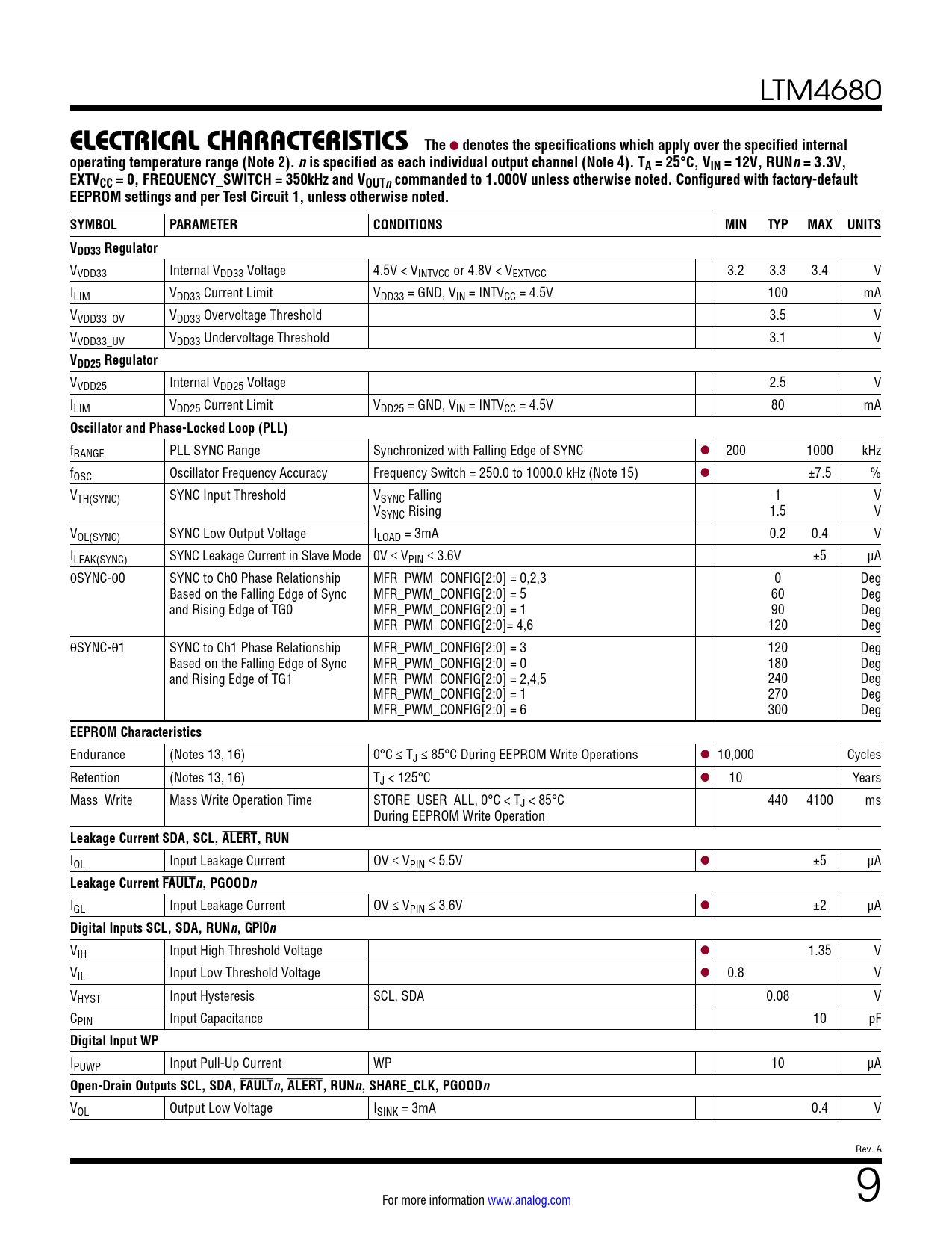 LTM4680 ELECTRICAL CHARACTERISTICSThe l denotes the specifications which apply over the specified internaloperating temperature range (Note 2). nis specified as each individual output channel (Note 4). TA = 25°C, VIN = 12V, RUNn= 3.3V,EXTVCC = 0, FREQUENCY_SWITCH = 350kHz and VOUTncommanded to 1.000V unless otherwise noted. Configured with factory-defaultEEPROM settings and per Test Circuit 1, unless otherwise noted.SYMBOLPARAMETERCONDITIONSMINTYPMAX UNITSVDD33 Regulator VVDD33 Internal VDD33 Voltage 4.5V < VINTVCC or 4.8V < VEXTVCC 3.2 3.3 3.4 V ILIM VDD33 Current Limit VDD33 = GND, VIN = INTVCC = 4.5V 100 mA VVDD33_OV VDD33 Overvoltage Threshold 3.5 V VVDD33_UV VDD33 Undervoltage Threshold 3.1 V VDD25 Regulator VVDD25 Internal VDD25 Voltage 2.5 V ILIM VDD25 Current Limit VDD25 = GND, VIN = INTVCC = 4.5V 80 mA Oscillator and Phase-Locked Loop (PLL) fRANGE PLL SYNC Range Synchronized with Falling Edge of SYNC l 200 1000 kHz fOSC Oscillator Frequency Accuracy Frequency Switch = 250.0 to 1000.0 kHz (Note 15) l ±7.5 % VTH(SYNC) SYNC Input Threshold VSYNC Falling 1 V VSYNC Rising 1.5 V VOL(SYNC) SYNC Low Output Voltage ILOAD = 3mA 0.2 0.4 V ILEAK(SYNC) SYNC Leakage Current in Slave Mode 0V ≤ VPIN ≤ 3.6V ±5 µA θSYNC-θ0 SYNC to Ch0 Phase Relationship MFR_PWM_CONFIG[2:0] = 0,2,3 0 Deg Based on the Falling Edge of Sync MFR_PWM_CONFIG[2:0] = 5 60 Deg and Rising Edge of TG0 MFR_PWM_CONFIG[2:0] = 1 90 Deg MFR_PWM_CONFIG[2:0]= 4,6 120 Deg θSYNC-θ1 SYNC to Ch1 Phase Relationship MFR_PWM_CONFIG[2:0] = 3 120 Deg Based on the Falling Edge of Sync MFR_PWM_CONFIG[2:0] = 0 180 Deg and Rising Edge of TG1 MFR_PWM_CONFIG[2:0] = 2,4,5 240 Deg MFR_PWM_CONFIG[2:0] = 1 270 Deg MFR_PWM_CONFIG[2:0] = 6 300 Deg EEPROM Characteristics Endurance (Notes 13, 16) 0°C ≤ TJ ≤ 85°C During EEPROM Write Operations l 10,000 Cycles Retention (Notes 13, 16) TJ < 125°C l 10 Years Mass_Write Mass Write Operation Time STORE_USER_ALL, 0°C < TJ < 85°C 440 4100 ms During EEPROM Write Operation Leakage Current SDA, SCL, ALERT, RUN IOL Input Leakage Current OV ≤ VPIN ≤ 5.5V l ±5 µA Leakage Current FAULTn, PGOODn IGL Input Leakage Current OV ≤ VPIN ≤ 3.6V l ±2 µA Digital Inputs SCL, SDA, RUNn, GPI0n VIH Input High Threshold Voltage l 1.35 V VIL Input Low Threshold Voltage l 0.8 V VHYST Input Hysteresis SCL, SDA 0.08 V CPIN Input Capacitance 10 pF Digital Input WP IPUWP Input Pull-Up Current WP 10 µA Open-Drain Outputs SCL, SDA, FAULTn, ALERT, RUNn, SHARE_CLK, PGOODn VOL Output Low Voltage ISINK = 3mA 0.4 V Rev. A For more information www.analog.com 9 Document Outline Features Applications Typical Application Description Table of Contents Absolute Maximum Ratings Order Information Pin Configuration Electrical Characteristics Typical Performance Characteristics Pin Functions Simplified Block Diagram Decoupling Requirements Functional Diagram Test Circuits Operation Power Module Introduction Power Module Overview, Major Features EEPROM with ECC Power-Up and Initialization Soft-Start Time-Based Sequencing Voltage-Based Sequencing Shutdown Light-Load Current Operation Switching Frequency and Phase PWM Loop Compensation Output Voltage Sensing INTVCC/EXTVCC Power Output Current Sensing and Sub Milliohm DCR Current Sensing Input Current Sensing PolyPhase Load Sharing External/Internal Temperature Sense RCONFIG (Resistor Configuration) Pins Table 1. VOUTn_CFG Pin Strapping Look-Up Table for the LTM4680’s Output Voltage, Coarse Setting (Not Applicable if MFR_CONFIG_ALL[6] = 1b) Table 2. VTRIMn_CFG Pin Strapping Look-Up Table for the LTM4680’s Output Voltage, Fine Adjustment Setting (Not Applicable if MFR_CONFIG_ALL[6] = 1b) Table 3. FSWPH_CFG Pin Strapping Look-Up Table to Set the LTM4680’s Switching Frequency and Channel Phase-Interleaving Angle (Not Applicable if MFR_CONFIG_ALL[6] = 1b) Table 4. ASEL Pin Strapping Look-Up Table to Set the LTM4680’s Slave Address (Applicable Regardless of MFR_CONFIG_ALL[6] Setting) Table 5. LTM4680 MFR_ADDRESS Command Examples Expressed in 7- and 8-Bit Addressing Fault Detection and Handling Status Registers and ALERT Masking Figure 5. LTM4680 Status Register Summary Mapping Faults to FAULT Pins Power Good Pins CRC Protection Serial Interface Communication Protection Device Addressing Responses to VOUT and IIN/IOUT Faults Output Overvoltage Fault Response Output Undervoltage Response Peak Output Overcurrent Fault Response Responses to Timing Faults Responses to VIN OV Faults Responses to OT/UT Faults Internal Overtemperature Fault Response External Overtemperature and Undertemperature Fault Response Responses to Input Overcurrent and Output Undercurrent Faults Responses to External Faults Fault Logging Bus Timeout Protection Similarity Between PMBus, SMBus and I2C 2-Wire Interface PMBus Serial Digital Interface Table 6. Abbreviations of Supported Data Formats Figure 6. PMBus Timing Diagram Figures 7 to 24 PMBus Protocols PMBus Command Summary PMBus Commands Table 7. PMBus Commands Summary (Note: The Data Format Abbreviations Are Detailed in Table 8) Table 8. Data Format Abbreviations Applications Information VIN to VOUT Step-Down Ratios Input Capacitors Output Capacitors Light Load Current Operation Switching Frequency and Phase Output Current Limit Programming Minimum On-Time Considerations Variable Delay Time, Soft-Start and Output Voltage Ramping Digital Servo Mode Soft Off (Sequenced Off) Undervoltage Lockout Fault Detection and Handling Open-Drain Pins Phase-Locked Loop and Frequency Synchronization Input Current Sense Amplifier Programmable Loop Compensation Checking Transient Response PolyPhase Configuration Connecting The USB to I2C/SMBus/PMBus Controller to the LTM4680 In System LTpowerPlay: An Interactive GUI for Digital Power PMBus Communication and Command Processing Thermal Considerations and Output Current Derating Tables 10 thru 11: Output Current Derating Table 12. Channel Output Voltage vs Capacitor Selection, All Ceramic Configuration, 15A to 30A Load St