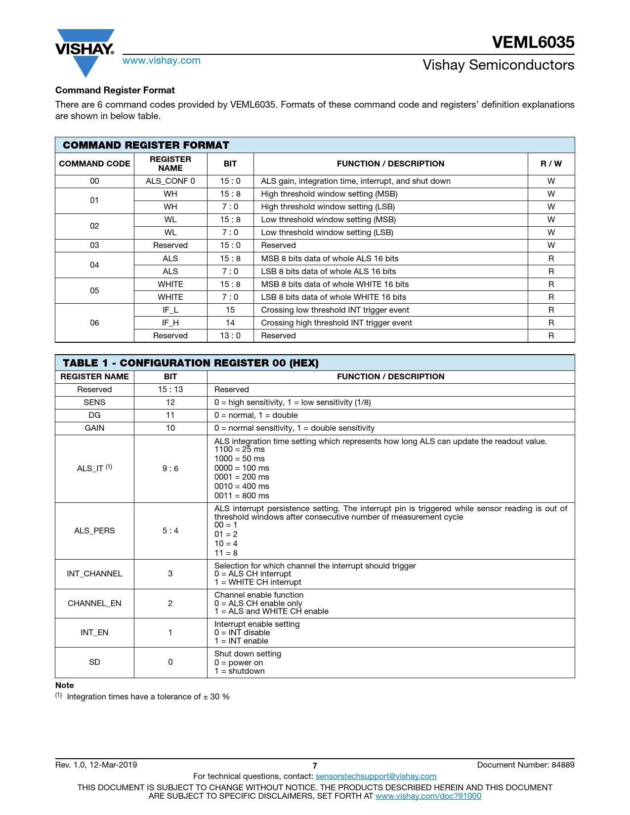 (1) Integration times have a tolerance of ± 30 % Rev. 1.0, 12-Mar-2019