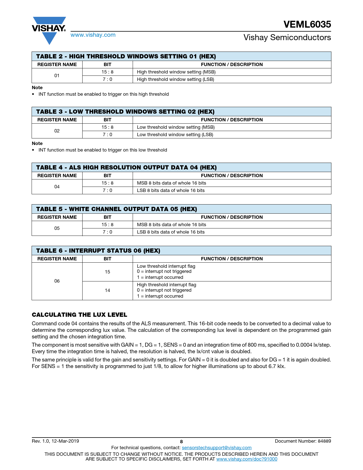 VEML6035 www.vishay.com Vishay Semiconductors TABLE 2 - HIGH THRESHOLD WINDOWS SETTING 01 (HEX)REGISTER NAMEBITFUNCTION / DESCRIPTION 15 : 8 High threshold window setting (MSB) 01 7 : 0 High threshold window setting (LSB) Note • INT function must be enabled to trigger on this high threshold TABLE 3 - LOW THRESHOLD WINDOWS SETTING 02 (HEX)REGISTER NAMEBITFUNCTION / DESCRIPTION 15 : 8 Low threshold window setting (MSB) 02 7 : 0 Low threshold window setting (LSB) Note • INT function must be enabled to trigger on this low threshold TABLE 4 - ALS HIGH RESOLUTION OUTPUT DATA 04 (HEX)REGISTER NAMEBITFUNCTION / DESCRIPTION 15 : 8 MSB 8 bits data of whole 16 bits 04 7 : 0 LSB 8 bits data of whole 16 bits TABLE 5 - WHITE CHANNEL OUTPUT DATA 05 (HEX)REGISTER NAMEBITFUNCTION / DESCRIPTION 15 : 8 MSB 8 bits data of whole 16 bits 05 7 : 0 LSB 8 bits data of whole 16 bits TABLE 6 - INTERRUPT STATUS 06 (HEX)REGISTER NAMEBITFUNCTION / DESCRIPTION Low threshold interrupt flag 15 0 = interrupt not triggered 1 = interrupt occurred 06 High threshold interrupt flag 14 0 = interrupt not triggered 1 = interrupt occurred CALCULATING THE LUX LEVEL Command code 04 contains the results of the ALS measurement. This 16-bit code needs to be converted to a decimal value to determine the corresponding lux value. The calculation of the corresponding lux level is dependent on the programmed gain setting and the chosen integration time. The component is most sensitive with GAIN = 1, DG = 1, SENS = 0 and an integration time of 800 ms, specified to 0.0004 lx/step. Every time the integration time is halved, the resolution is halved, the lx/cnt value is doubled. The same principle is valid for the gain and sensitivity settings. For GAIN = 0 it is doubled and also for DG = 1 it is again doubled. For SENS = 1 the sensitivity is programmed to just 1/8, to allow for higher illuminations up to about 6.7 klx. Rev. 1.0, 12-Mar-2019 8 Document Number: 84889 For technical questions, contact: sensorstechsupport@vishay.com THIS DOCUMENT IS SUBJECT TO CHANGE WITHOUT NOTICE. THE PRODUCTS DESCRIBED HEREIN AND THIS DOCUMENT ARE SUBJECT TO SPECIFIC DISCLAIMERS, SET FORTH AT www.vishay.com/doc?91000