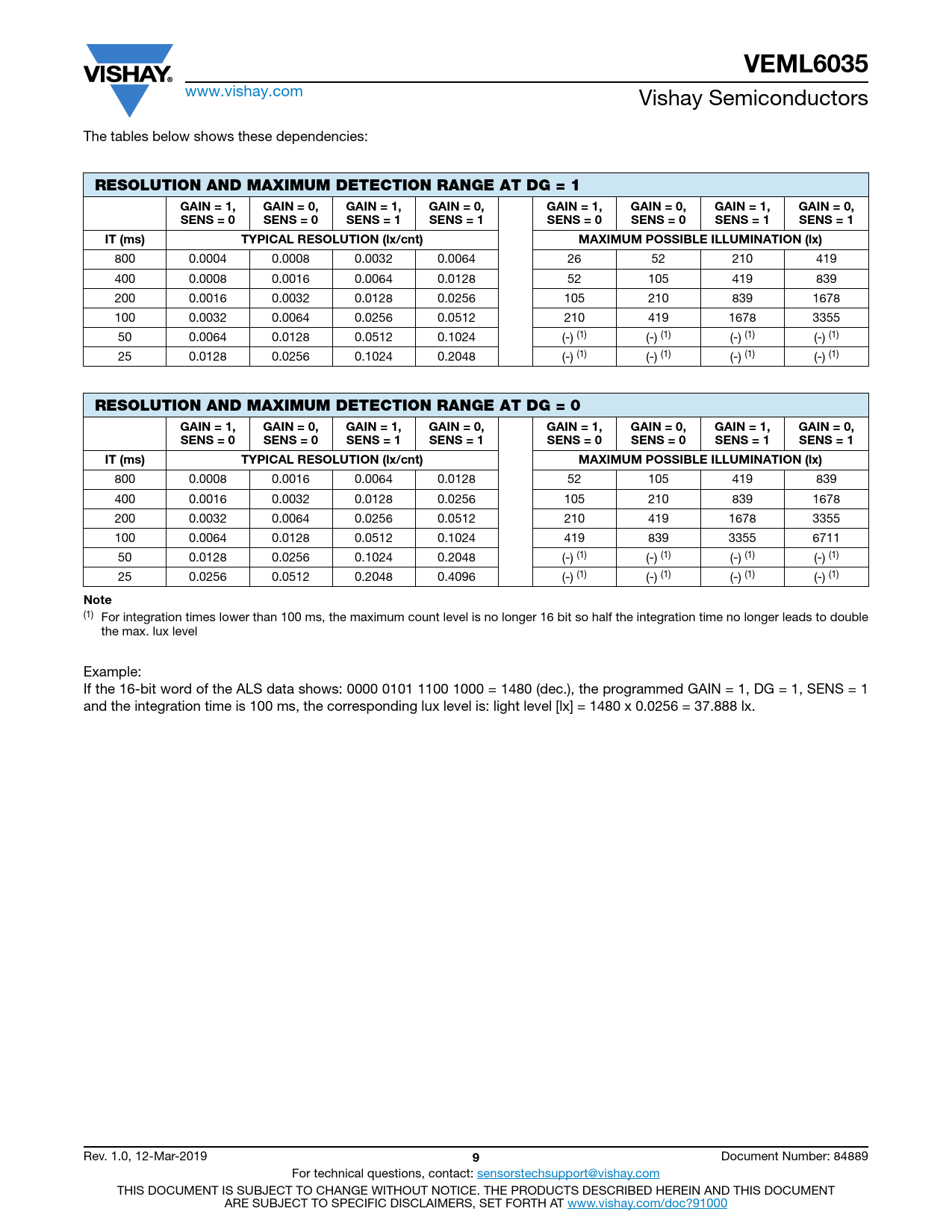 (1) For integration times lower than 100 ms, the maximum count level is no longer 16 bit so half the integration time no longer leads to double the max. lux level Example: If the 16-bit word of the ALS data shows: 0000 0101 1100 1000 = 1480 (dec.), the programmed GAIN = 1, DG = 1, SENS = 1 and the integration time is 100 ms, the corresponding lux level is: light level [lx] = 1480 x 0.0256 = 37.888 lx. Rev. 1.0, 12-Mar-2019