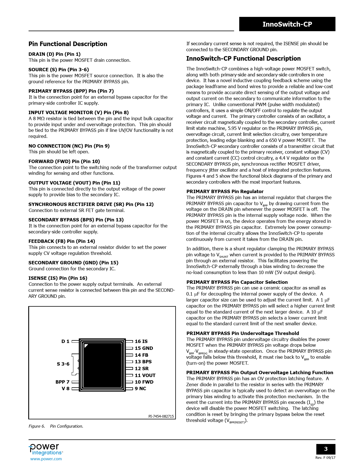 InnoSwitch-CPPin Functional Description If secondary current sense is not required, the ISENSE pin should be connected to the SECONDARY GROUND pin. DRAIN (D) Pin (Pin 1) This pin is the power MOSFET drain connection. InnoSwitch-CP Functional DescriptionSOURCE (S) Pin (Pin 3-6) The InnoSwitch-CP combines a high-voltage power MOSFET switch, This pin is the power MOSFET source connection. It is also the along with both primary-side and secondary-side control ers in one ground reference for the PRIMARY BYPASS pin. device. It has a novel inductive coupling feedback scheme using the package leadframe and bond wires to provide a reliable and low-cost PRIMARY BYPASS (BPP) Pin (Pin 7) means to provide accurate direct sensing of the output voltage and It is the connection point for an external bypass capacitor for the output current on the secondary to communicate information to the primary-side control er IC supply. primary IC. Unlike conventional PWM (pulse width modulated) INPUT VOLTAGE MONITOR (V) Pin (Pin 8) control ers, it uses a simple ON/OFF control to regulate the output A 8 MW resistor is tied between the pin and the input bulk capacitor voltage and current. The primary control er consists of an oscillator, a to provide input under and overvoltage protection. This pin should receiver circuit magnetical y coupled to the secondary control er, current be tied to the PRIMARY BYPASS pin if line UV/OV functionality is not limit state machine, 5.95 V regulator on the PRIMARY BYPASS pin, required. overvoltage circuit, current limit selection circuitry, over temperature protection, leading edge blanking and a 650 V power MOSFET. The NO CONNECTION (NC) Pin (Pin 9) InnoSwitch-CP secondary control er consists of a transmitter circuit that This pin should be left open. is magnetical y coupled to the primary receiver, constant voltage (CV) and constant current (CC) control circuitry, a 4.4 V regulator on the FORWARD (FWD) Pin (Pin 10) SECONDARY BYPASS pin, synchronous rectifier MOSFET driver, The connection point to the switching node of the transformer output frequency jitter oscillator and a host of integrated protection features. winding for sensing and other functions. Figures 4 and 5 show the functional block diagrams of the primary and OUTPUT VOLTAGE (VOUT) Pin (Pin 11) secondary control ers with the most important features. This pin is connected directly to the output voltage of the power PRIMARY BYPASS Pin Regulator supply to provide bias to the secondary IC. The PRIMARY BYPASS pin has an internal regulator that charges the SYNCHRONOUS RECTIFIER DRIVE (SR) Pin (Pin 12) PRIMARY BYPASS pin capacitor to V by drawing current from the BPP Connection to external SR FET gate terminal. voltage on the DRAIN pin whenever the power MOSFET is off. The PRIMARY BYPASS pin is the internal supply voltage node. When the SECONDARY BYPASS (BPS) Pin (Pin 13) power MOSFET is on, the device operates from the energy stored in It is the connection point for an external bypass capacitor for the the PRIMARY BYPASS pin capacitor. Extremely low power consump- secondary-side control er supply. tion of the internal circuitry al ows the InnoSwitch-CP to operate FEEDBACK (FB) Pin (Pin 14) continuously from current it takes from the DRAIN pin. This pin connects to an external resistor divider to set the power In addition, there is a shunt regulator clamping the PRIMARY BYPASS supply CV voltage regulation threshold. pin voltage to V when current is provided to the PRIMARY BYPASS SHUNT SECONDARY GROUND (GND) (Pin 15) pin through an external resistor. This facilitates powering the Ground connection for the secondary IC. InnoSwitch-CP external y through a bias winding to decrease the no-load consumption to less than 10 mW (5V output design). ISENSE (IS) Pin (Pin 16) Connection to the power supply output terminals. An external PRIMARY BYPASS Pin Capacitor Selection current sense resistor is connected between this pin and the SECOND- The PRIMARY BYPASS pin can use a ceramic capacitor as small as ARY GROUND pin. 0.1 mF for decoupling the internal power supply of the device. A larger capacitor size can be used to adjust the current limit. A 1 mF capacitor on the PRIMARY BYPASS pin will select a higher current limit equal to the standard current of the next larger device. A 10 mF capacitor on the PRIMARY BYPASS pin selects a lower current limit equal to the standard current limit of the next smal er device. PRIMARY BYPASS Pin Undervoltage ThresholdD 116 IS The PRIMARY BYPASS pin undervoltage circuitry disables the power 15 GND MOSFET when the PRIMARY BYPASS pin voltage drops below V -V in steady-state operation. Once the PRIMARY BYPASS pin 14 FB BPP BPP(H) voltage fal s below this threshold, it must rise back to V to enable 13 BPS BPP S 3-6 (turn-on) the power MOSFET. 12 SR 11 VOUTPRIMARY BYPASS Pin Output Overvoltage Latching Function The PRIMARY BYPASS pin has an OV protection latching feature. A BPP 710 FWD Zener diode in paral el to the resistor in series with the PRIMARY V 89 NC BYPASS pin capacitor is typical y used to detect an overvoltage on the primary bias winding to activate this protection mechanism. In the event the current into the PRIMARY BYPASS pin exceeds (I ) the SD device will disable the power MOSFET switching. The latching PI-7454-082715 condition is reset by bringing the primary bypass below the reset threshold voltage (V ). BPP(RESET) Figure 6. Pin Configuration. 3 Rev. F 09/17 www.power.com Document Outline Product Highlights Highly Integrated, Compact Footprint EcoSmart - Energy Efficient Advanced Protection / Safety Features Full Safety and Regulatory Compliance Green Package Applications Description Output Power Table Pin Functional Description InnoSwitch-CP Functional Description InnoSwitch-CP Operation Applications Example Key application Considerations Selection of Components Recommendations for Circuit Board Layout Recommendations for EMI Reduction Recommendations for Audible Noise Suppression Recommenda