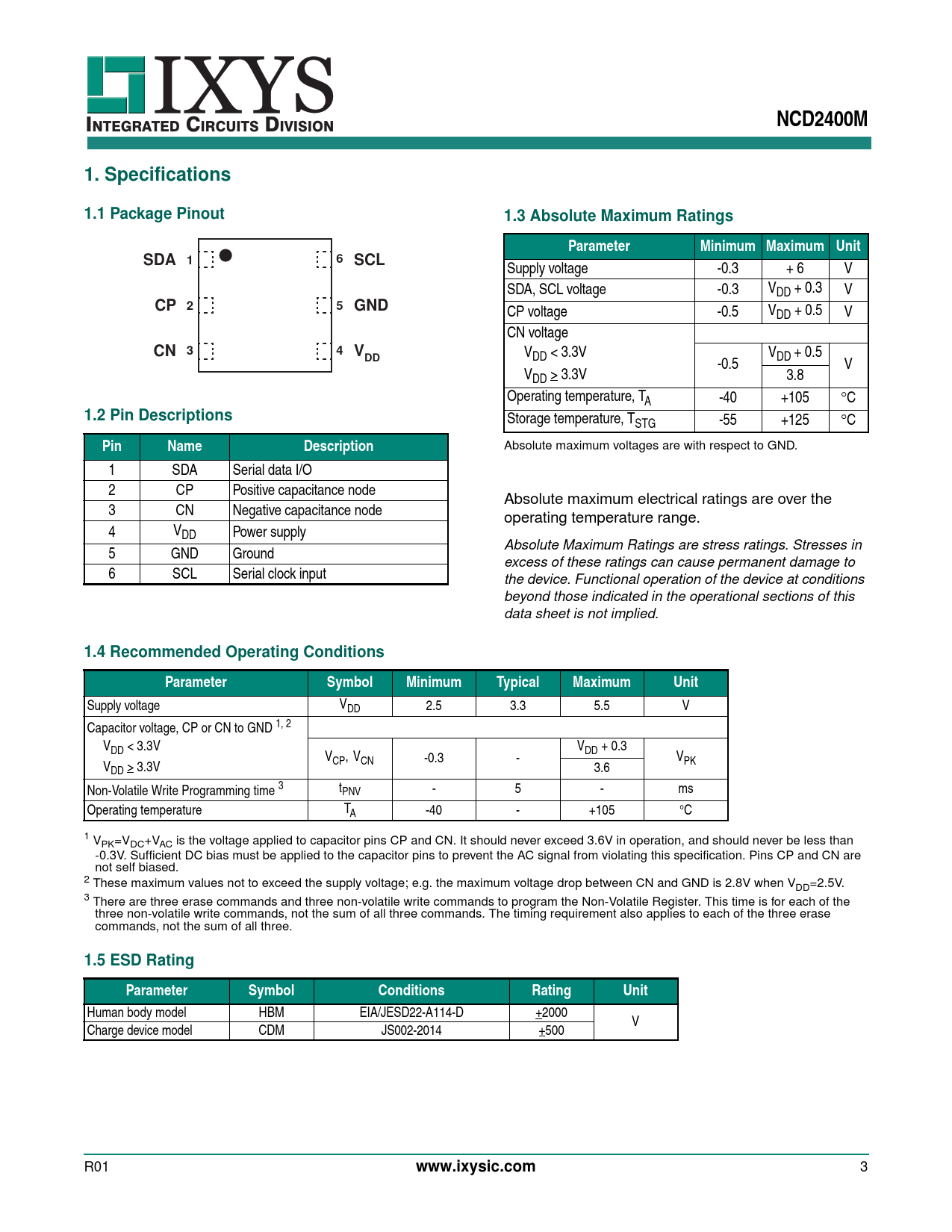 Seiten / Seite22 / 3 — NCD2400M. 1. Specifications. 1.1 Package Pinout. 1.3 Absolute Maximum …