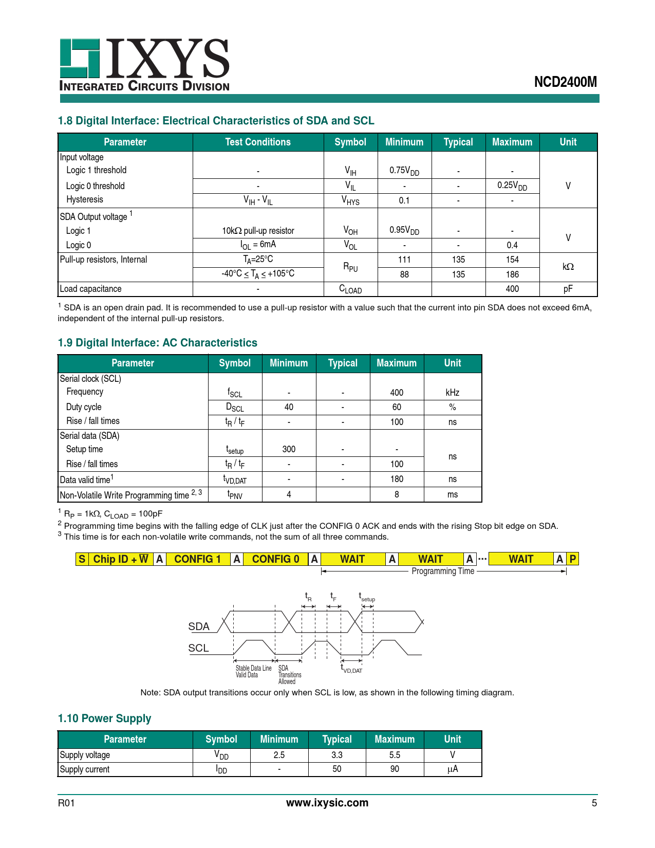 NCD2400M 1.8 Digital Interface: Electrical Characteristics of SDA and SCL Parameter Test Conditions Symbol Minimum Typical Maximum Unit