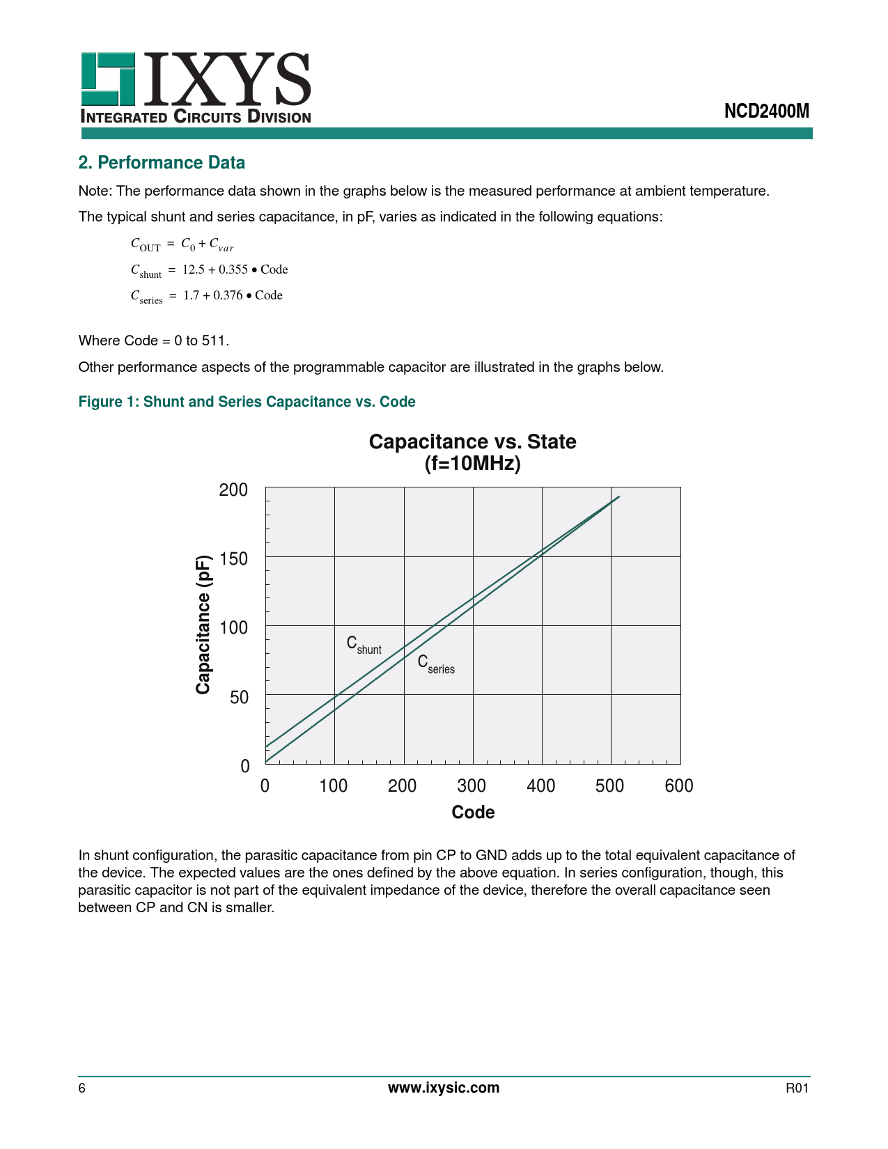 INTEGRATED CIRCUITS DIVISION NCD2400M2. Performance Data Note: The performance data shown in the graphs below is the measured performance at ambient temperature. The typical shunt and series capacitance, in pF, varies as indicated in the following equations: C = C + C OUT 0 var C = 12.5 + 0.355 Code shunt C = 1.7 + 0.376 Code series Where Code = 0 to 511. Other performance aspects of the programmable capacitor are illustrated in the graphs below. Figure 1: Shunt and Series Capacitance vs. CodeCapacitance vs. State(f=10MHz) 200 150 100 Cshunt Cseries Capacitance (pF) 50 0 0 100 200 300 400 500 600 Code In shunt configuration, the parasitic capacitance from pin CP to GND adds up to the total equivalent capacitance of the device. The expected values are the ones defined by the above equation. In series configuration, though, this parasitic capacitor is not part of the equivalent impedance of the device, therefore the overall capacitance seen between CP and CN is smaller. 6 www.ixysic.com R01 Document Outline Features Applications Description 1. Specifications 1.1 Package Pinout 1.2 Pin Descriptions 1.3 Absolute Maximum Ratings 1.4 Recommended Operating Conditions 1.5 ESD Rating 1.6 General Conditions for Electrical Characteristics 1.7 Capacitor Electrical Characteristics 1.8 Digital Interface: Electrical Characteristics of SDA and SCL 1.9 Digital Interface: AC Characteristics 1.10 Power Supply 2. Performance Data 3. Functional Description 3.1 Introduction 3.2 Capacitive Digital to Analog Converter (CDAC) 3.3 Non-Volatile Memory Configuration 3.4 Device Address 3.5 Operating Modes 3.5.1 Volatile Mode 3.5.2 Non-Volatile Mode 3.6 I2C Serial Interface 3.6.1 Write Commands 3.6.2 Write Volatile Register Operation 3.6.3 Write Non-Volatile Memory Operation 3.6.4 Read Operation 3.6.5 Set Non-Volatile Mode Operation 3.6.6 Electrical and Timing Considerations 3.6.7 Application Diagrams 3.7 Capacitor Interface Electrical and Biasing Considerations 4. Capacitance Determination and Programming Procedure 5. Manufacturing Information 5.1 Moisture Sensitivity 5.2 ESD Sensitivity 5.3 Soldering Profile 5.4 Board Wash 5.5 Mechanical Dimensions 5.5.1 Package Dimensions 5.5.2 Tape & Reel Specification